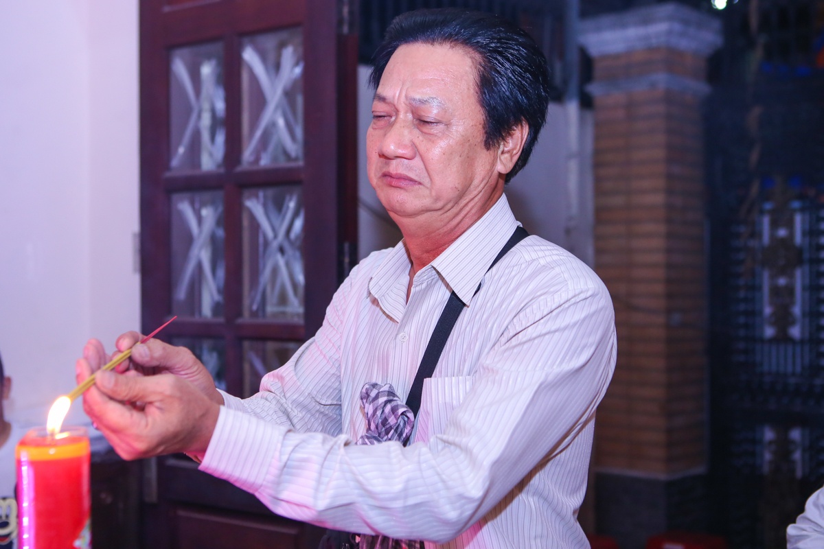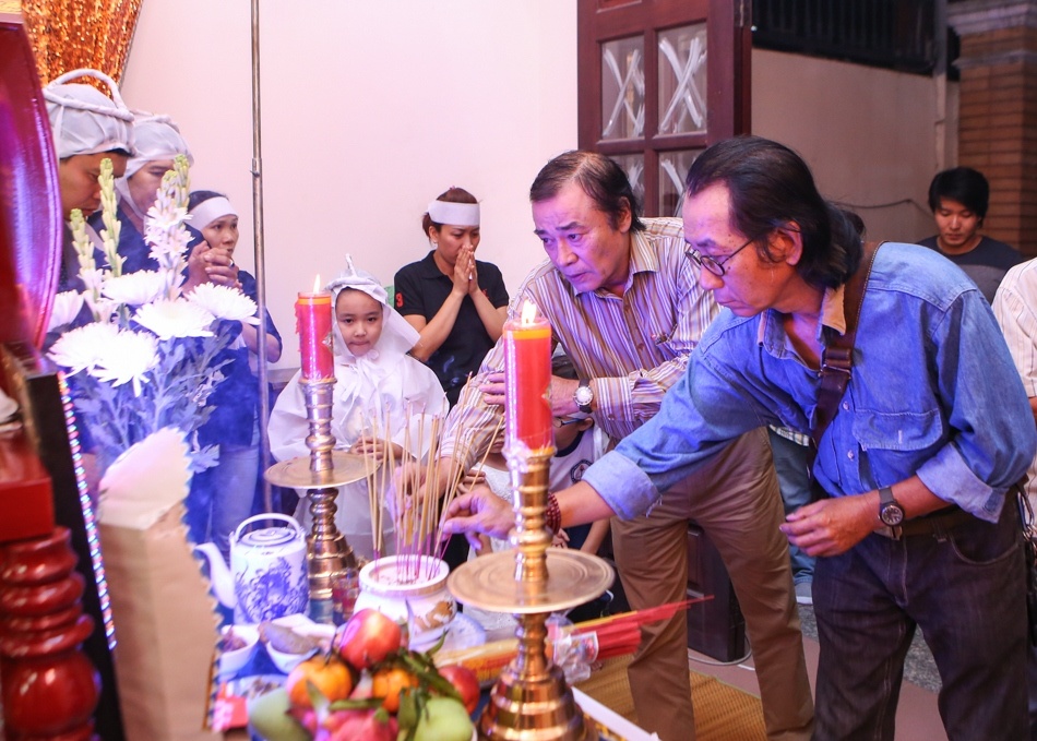 | Đạo diễn Đào Bá Sơn (áo kẻ) cũng đến thắp hương, từ biệt đồng nghiệp và chia buồn với gia đình. |