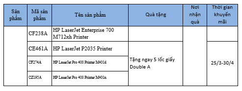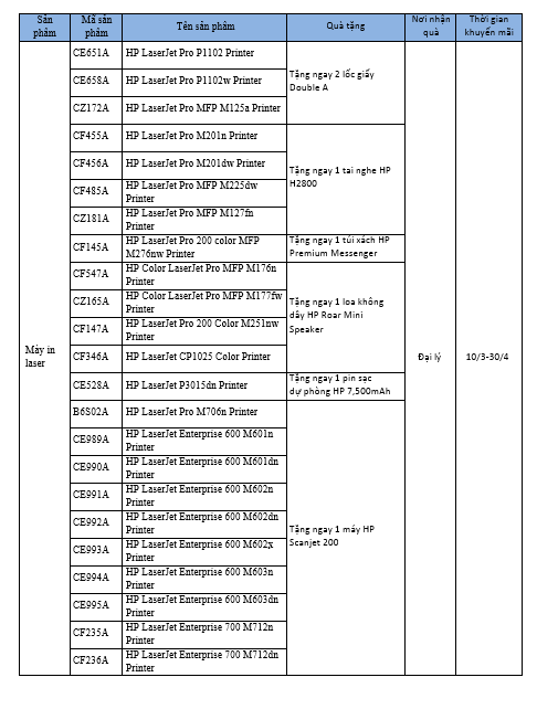 Danh mục sản phẩm và quà tặng chương trình khuyến mãi Xuân nghinh lộc cùng máy in HP: