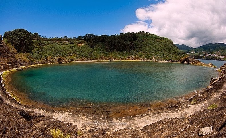 | Những bức tường của miệng núi lửa được lót bởi thảm thực vật đặc hữu, trong khi bên trong có một hồ nước tự nhiên gần như có hình tròn hoàn hảo, được nối với biển bằng một con kênh hẹp. Ở chỗ mở của miệng được gọi là Boquete và đối mặt với hướng bắc bờ biển São Miguel. Con kênh cho phép lưu thông nước giữa đại dương và vùng đầm phá trong khi đó ngăn chặn những con sóng xâm nhập vào miệng núi lửa hình tròn tuyệt đẹp này. Cũng nhờ có con kênh này mà cuộc sống của những loài động vật biển trên đảo phong phú hơn như nhiều loài chim, động vật giáp xác, cá và các loại tảo phát triển mạnh. |