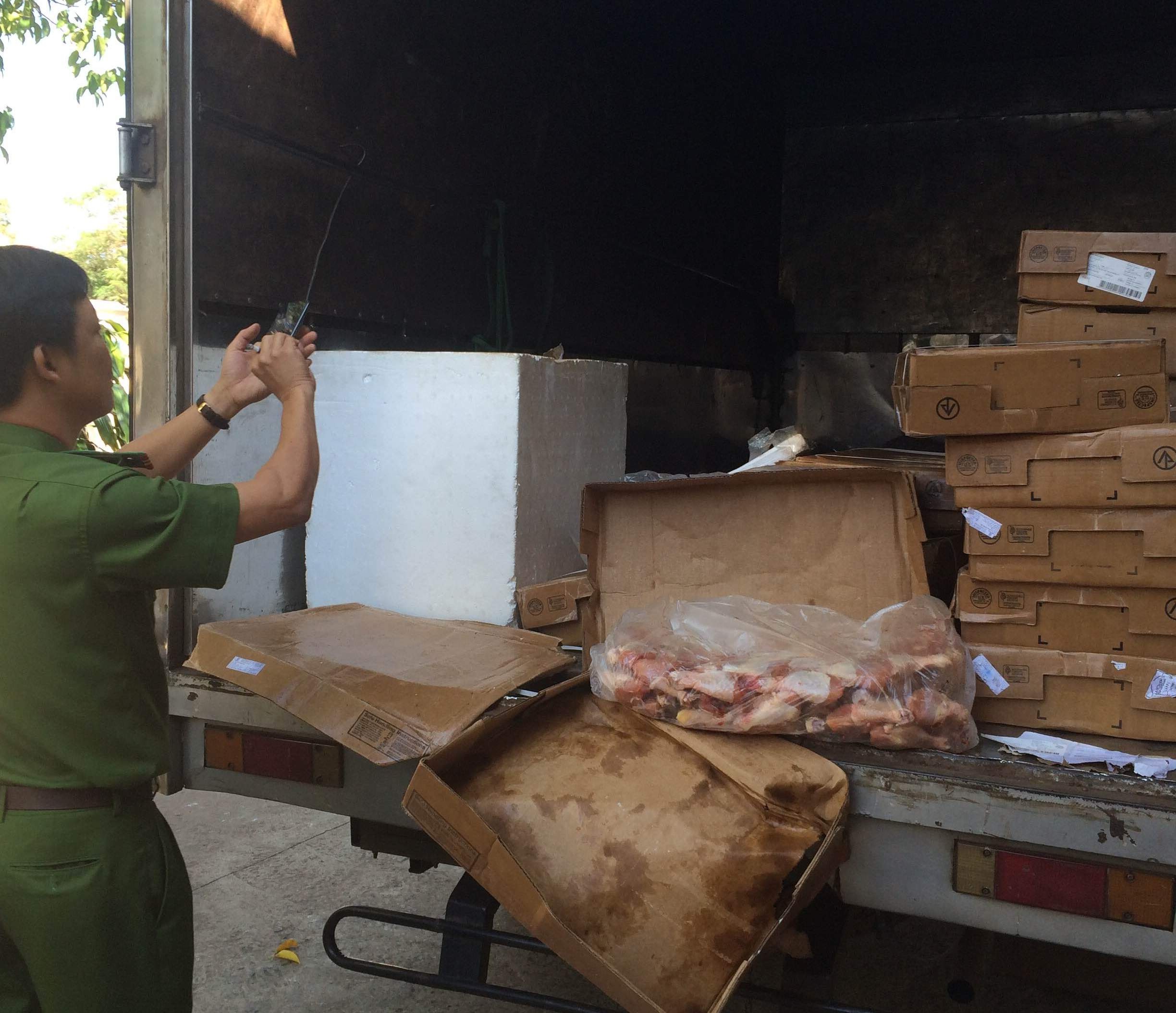 Làm việc với cơ quan chức năng, bà Vũ Thị Cẩm (chủ lô hàng) không xuất trình được hóa đơn chứng minh nguồn gốc của số thịt gà trên.