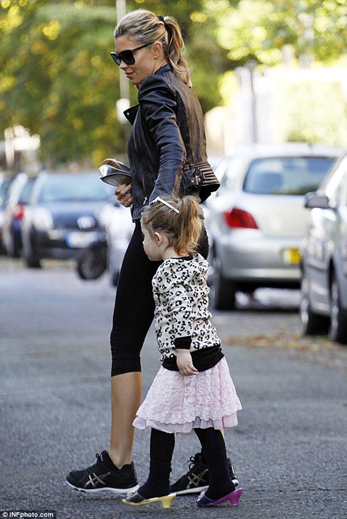 | Cô công chúa nhà Crouch diện áo da báo sành điệu, chân đầm công chúa kết hợp với một đôi guốc 2 màu vô cùng dễ thương lẽo đẽo bám tay mẹ đi shopping. |