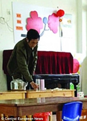 Họ bắt được hình ảnh của thầy giáo Gao Chao, 54 tuổi, tay cầm điếu thuốc và đi tiểu vào một phích màu hồng.
