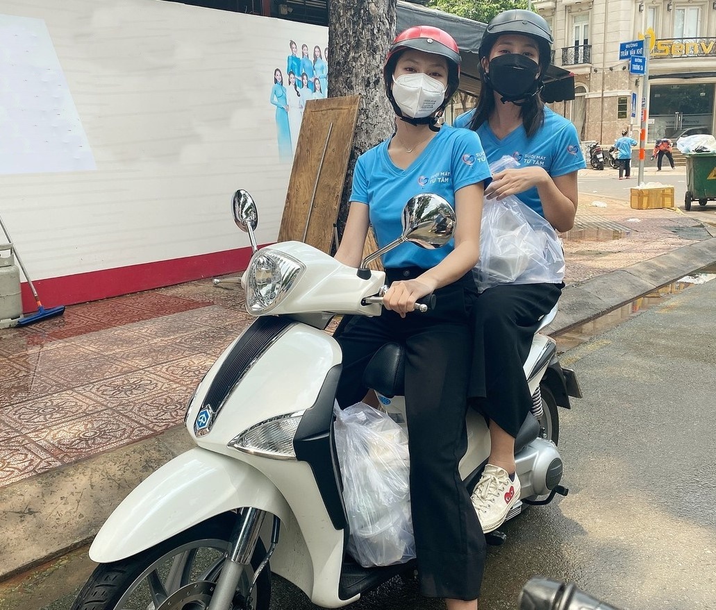 | Trước khi người dân TP.HCM bước vào thời gian "ai ở đâu ở yên đó", ngày 21/8, Hoa hậu Tiểu Vy và Á hậu Ngọc Thảo tham gia công việc từ thiện, tự chạy xe máy đi giao cơm cho các chiến sĩ chống dịch tuyến đầu. |