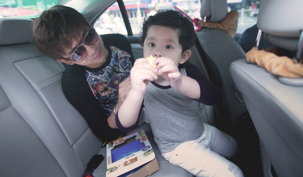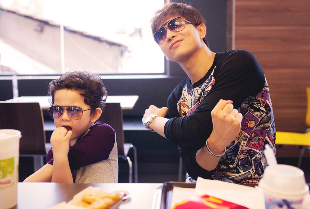 Ông bố nổi tiếng và cậu con trai đáng yêu mặc sành điệu, đi ăn gà rán bằng xế sang.