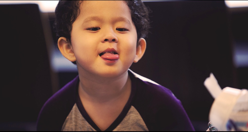 Bé Sushi làm mặt ngầu trước ống kính. "Bé có năng khiếu nghệ thuật rất sớm. Bé vừa nhảy vừa hát rất giỏi. Có lẽ, con trai ảnh hưởng điều này từ bố mẹ" - nam ca sĩ nói.