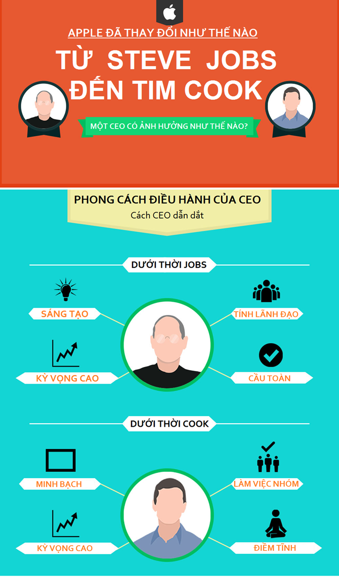 Nhìn vào các yếu tố trong đó có sản phẩm, scandal, cổ tức, trường đại học Ohio University đã tạo ra một bản infographic so sánh Apple dưới hai "triều đại" CEO Steve Jobs và Tim Cook: