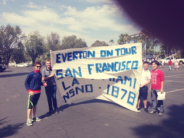 | Tim bên cạnh các fan cuồng của Real và Everton. |