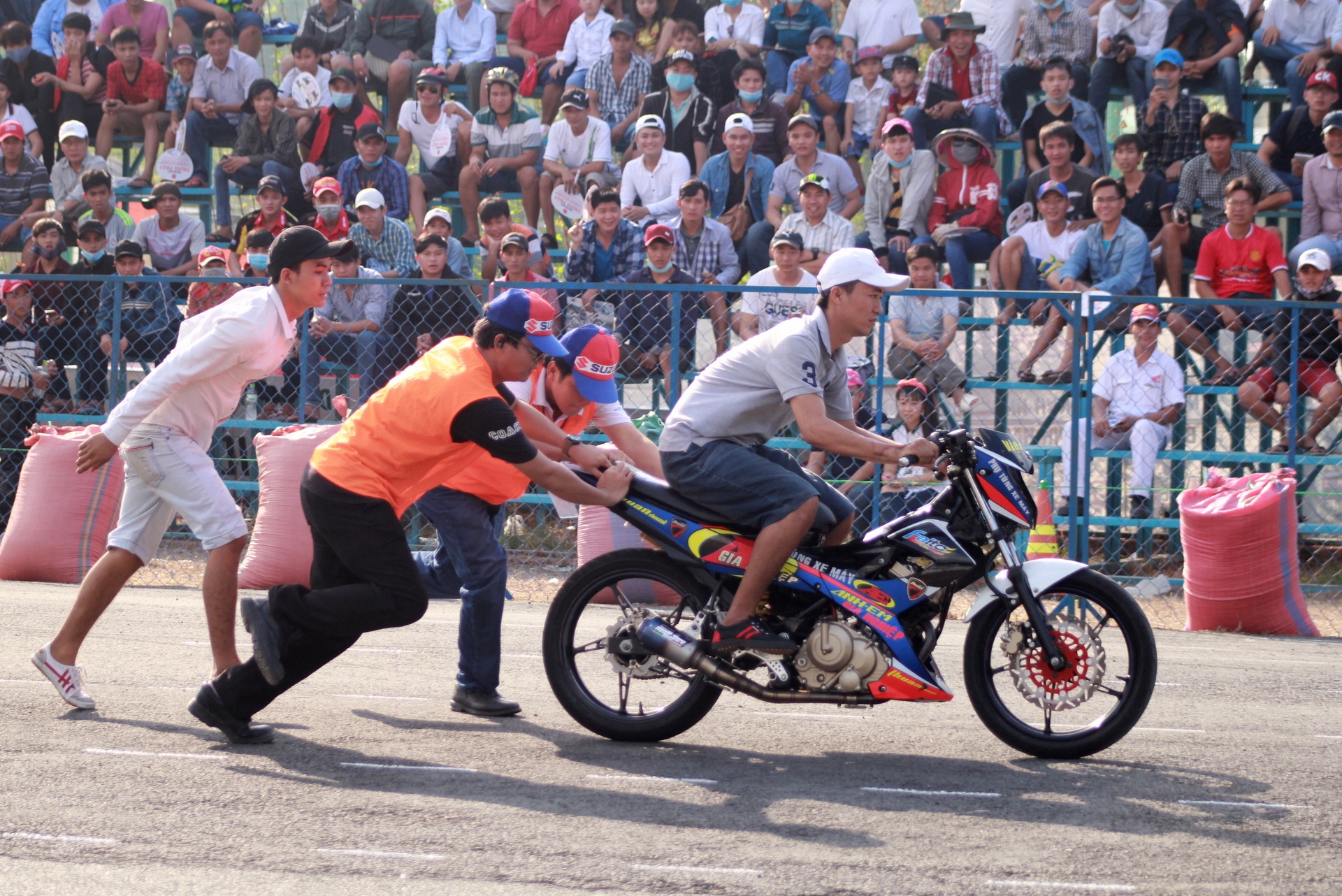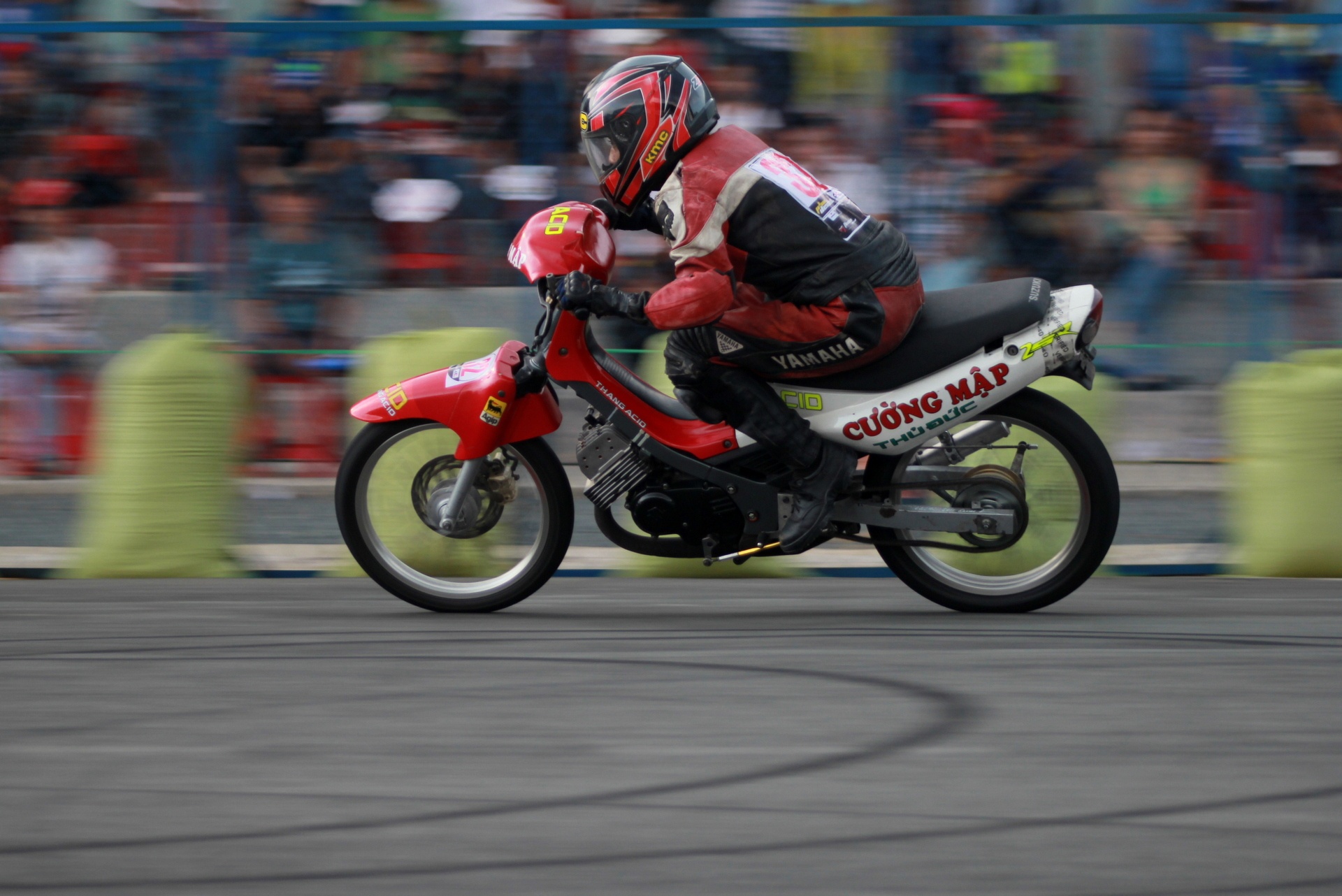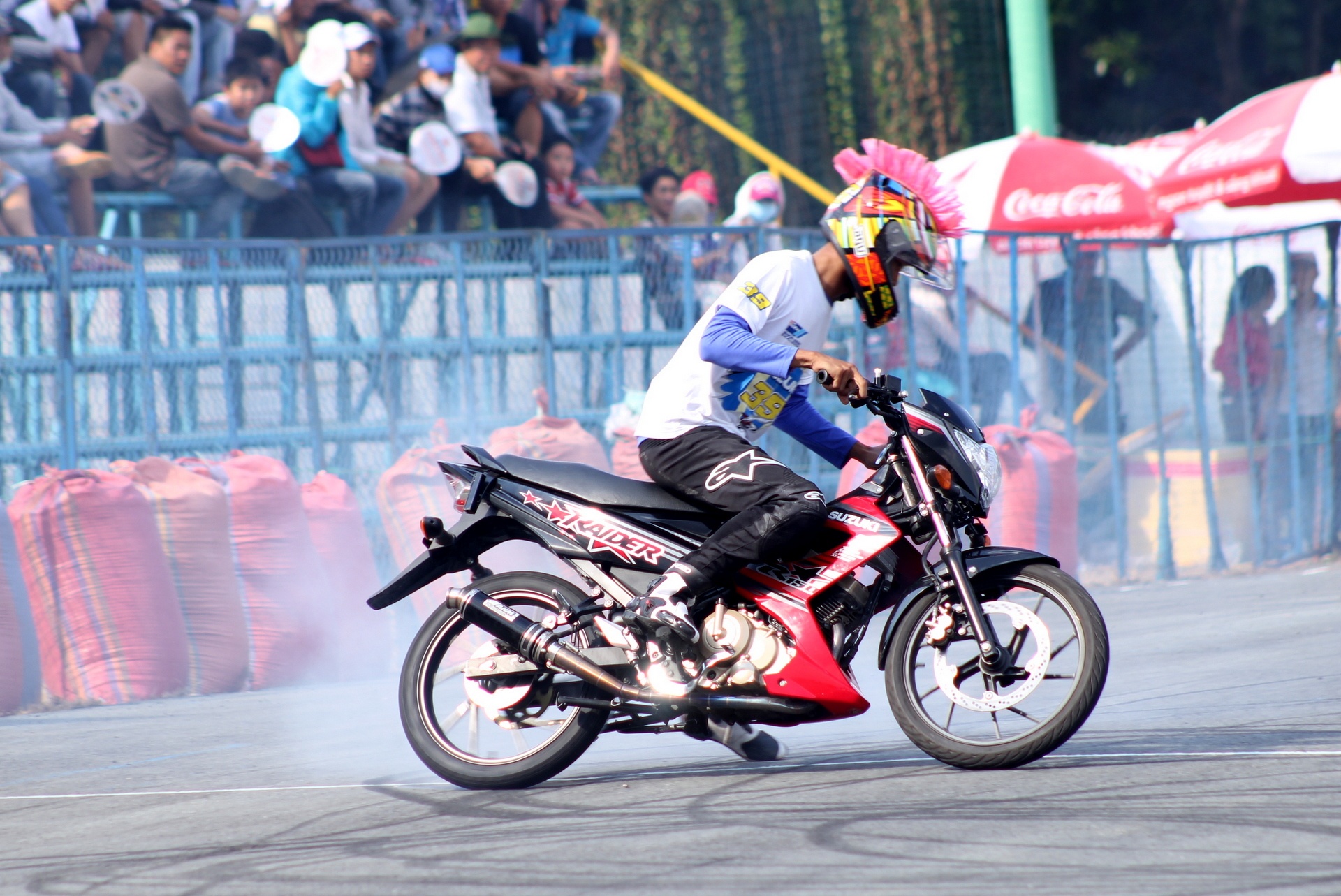 | Trước khi vòng đấu chính thức bắt đầu, một stunter biểu diễn các kỹ thuật đốt lốp bằng xe Raider R150 khiến khán giả thích thú. Với sức mạnh 15,6 mã lực và 12.4 Nm mô-men xoắn, Raider là chiếc xe khá mạnh, thậm chí chưa cần độ chế. |