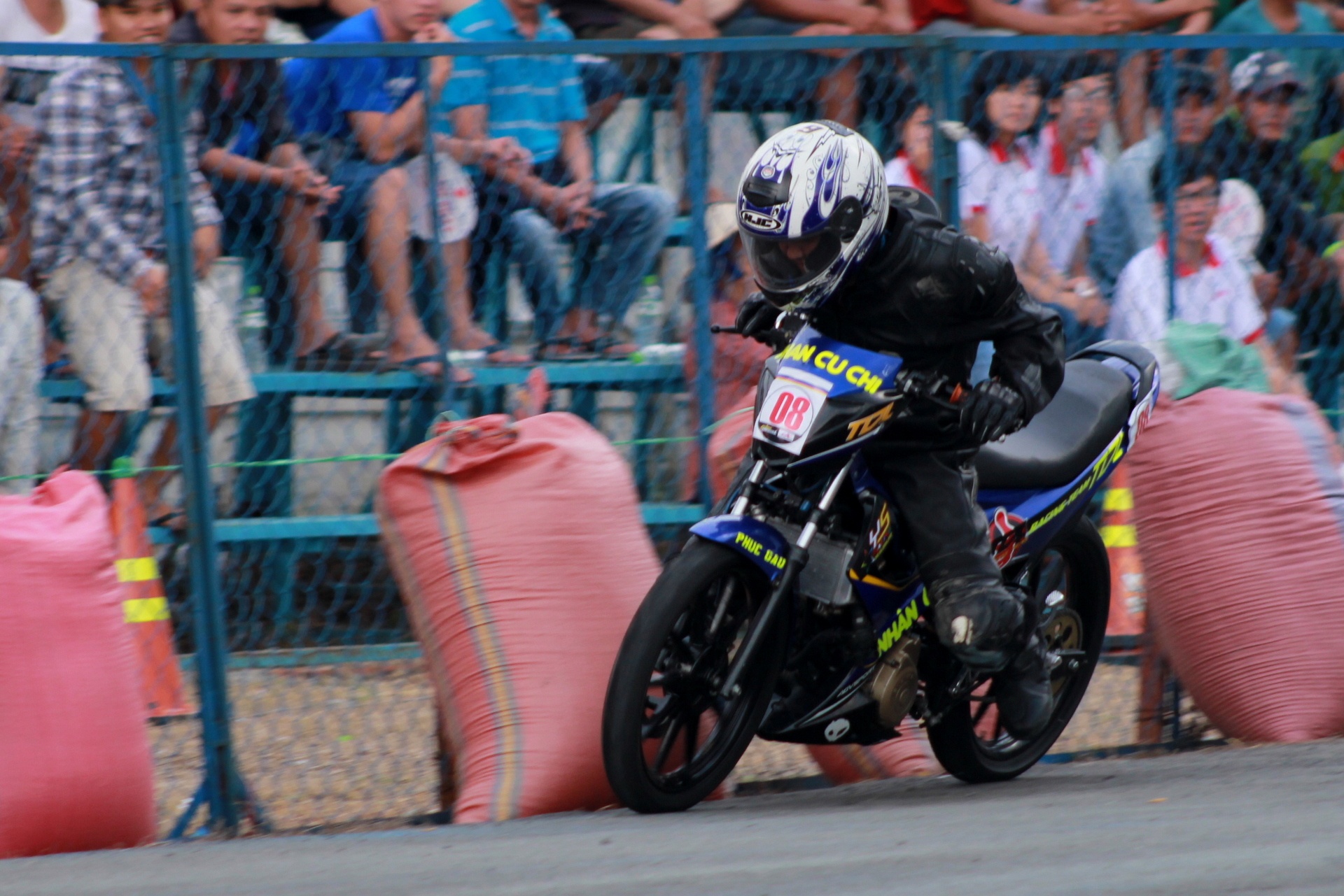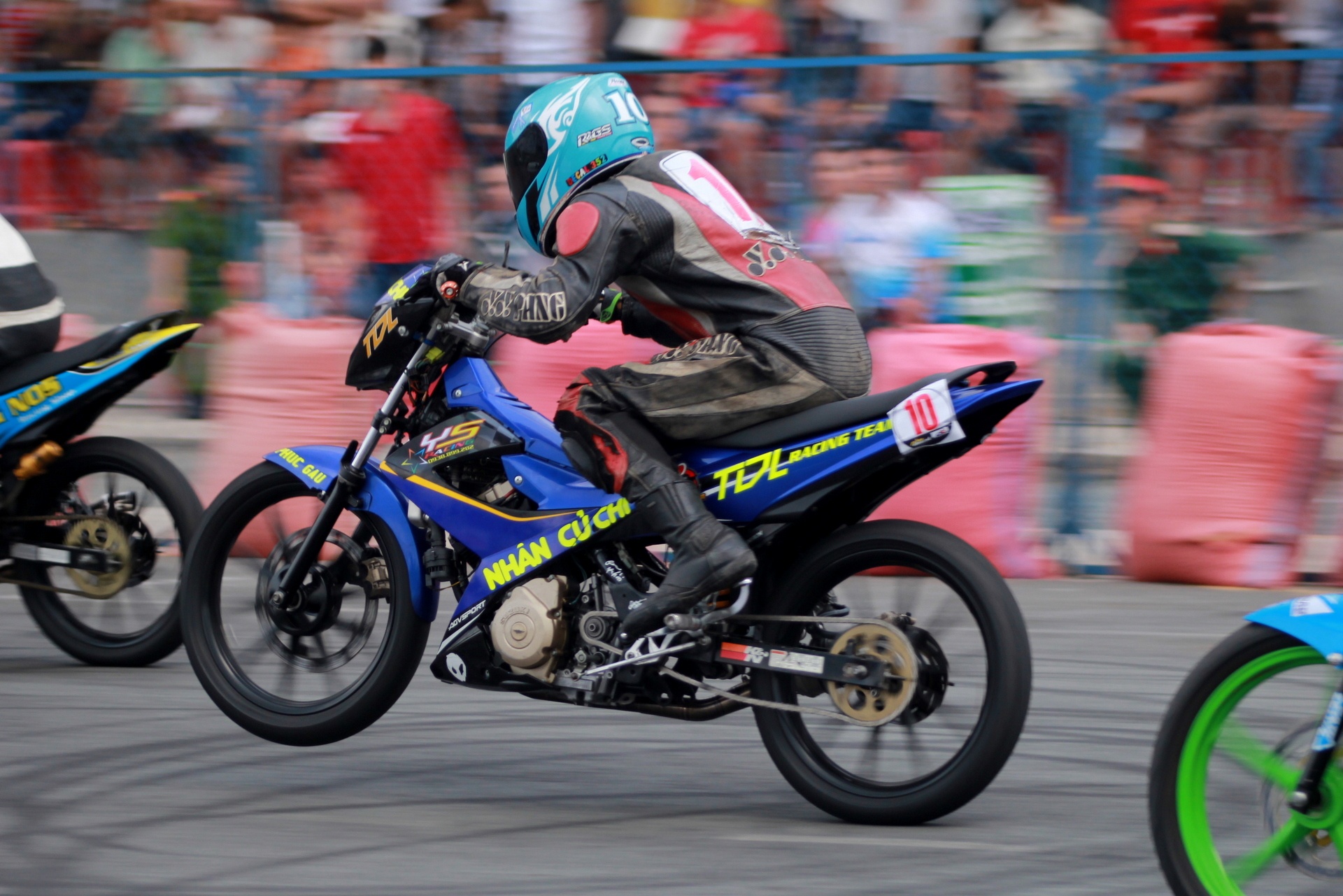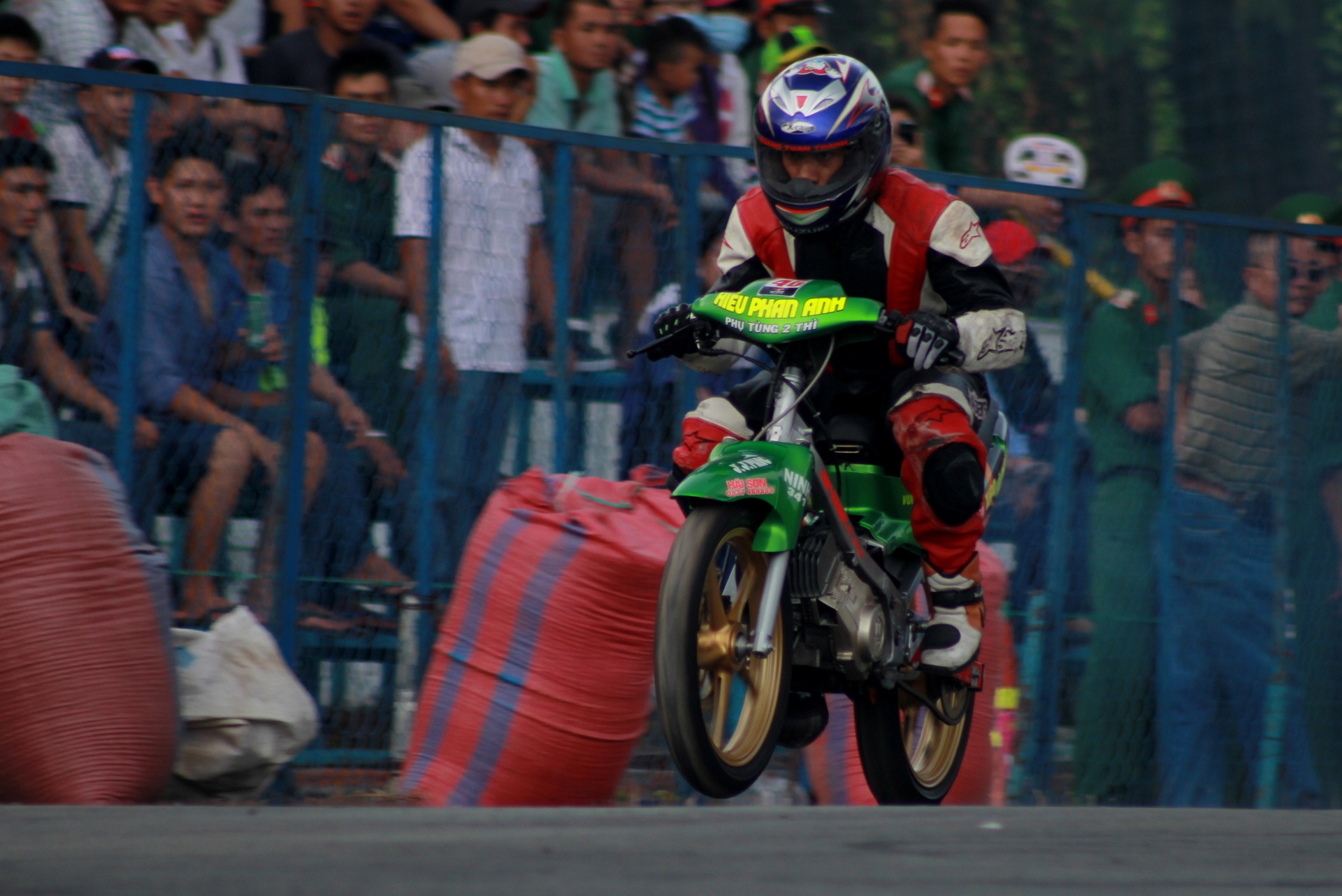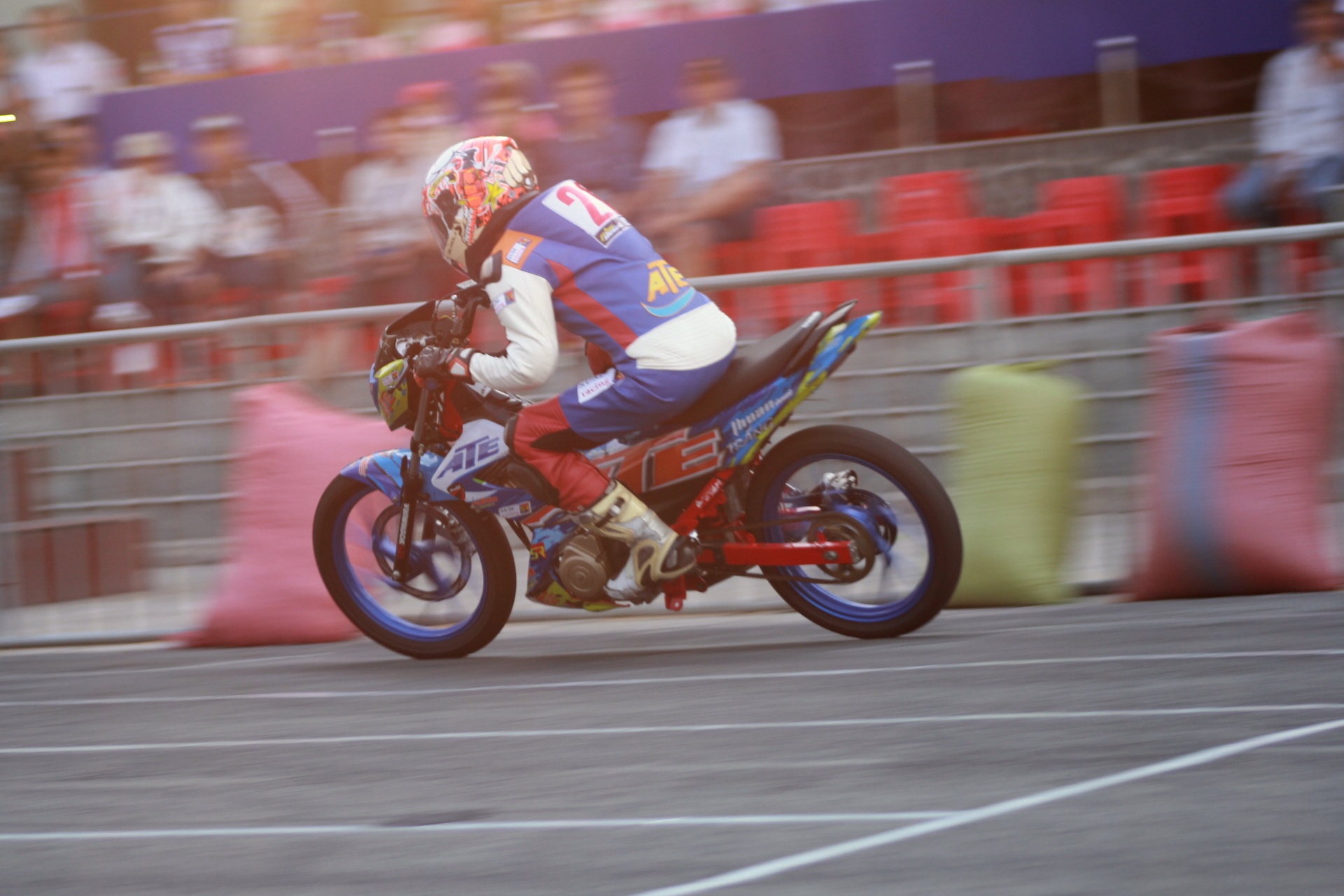 | Trước khi vòng đấu chính thức bắt đầu, một stunter biểu diễn các kỹ thuật đốt lốp bằng xe Raider R150 khiến khán giả thích thú. Với sức mạnh 15,6 mã lực và 12.4 Nm mô-men xoắn, Raider là chiếc xe khá mạnh, thậm chí chưa cần độ chế. |