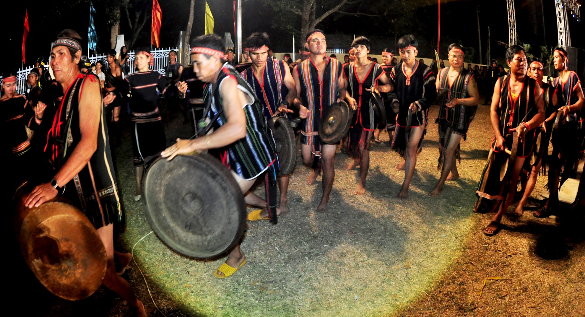| Các nghệ nhân trình diễn cồng chiêng tại Liên hoan nghệ thuật dân gian Tây Nguyên tại Kon Tum tối 20/3. Ảnh: M.Hoàng. |