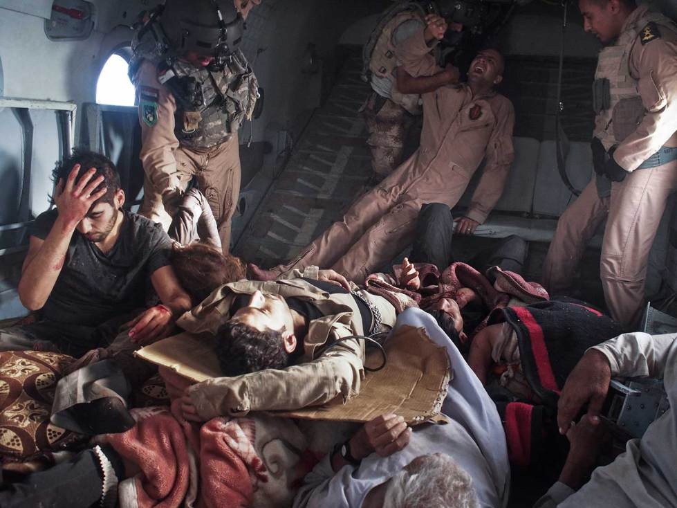 Trực thăng của quân đội Iraq giải cứu tộc người bị thảm sát trên núi Sinja hôm 12/8. Lực lượng tự xưng Nhà nước Hồi giáo (IS) liên tiếp truy sát tộc người Yazidi thiểu số sau khi chiếm nhiều thành phố ở Iraq. Quân đội Iraq phải dùng trực thăng để thả hàng cứu trợ cho những người mắc kẹt trước khi sơ tán họ khỏi khu vực nguy hiểm. Dù Mỹ và đồng minh đã phát động chiến dịch không kích IS nhưng không thể ngăn chặn lực lương này lộng hành ở Iraq và Syria. Ảnh: Time |