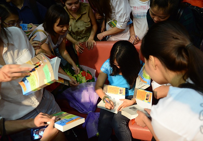 | Huyền Chip ký tặng sách độc giả. (Ảnh: Tuấn Mark). |