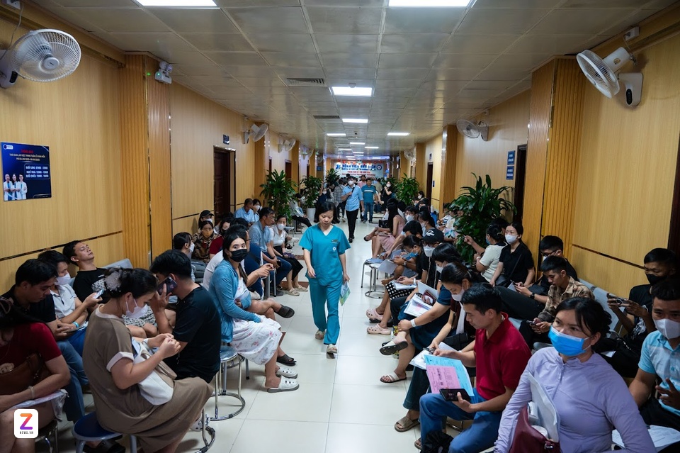 Người dân chờ khám tại Bệnh viện Bưu Điện, Hà Nội. Ảnh: Đinh Hà. |