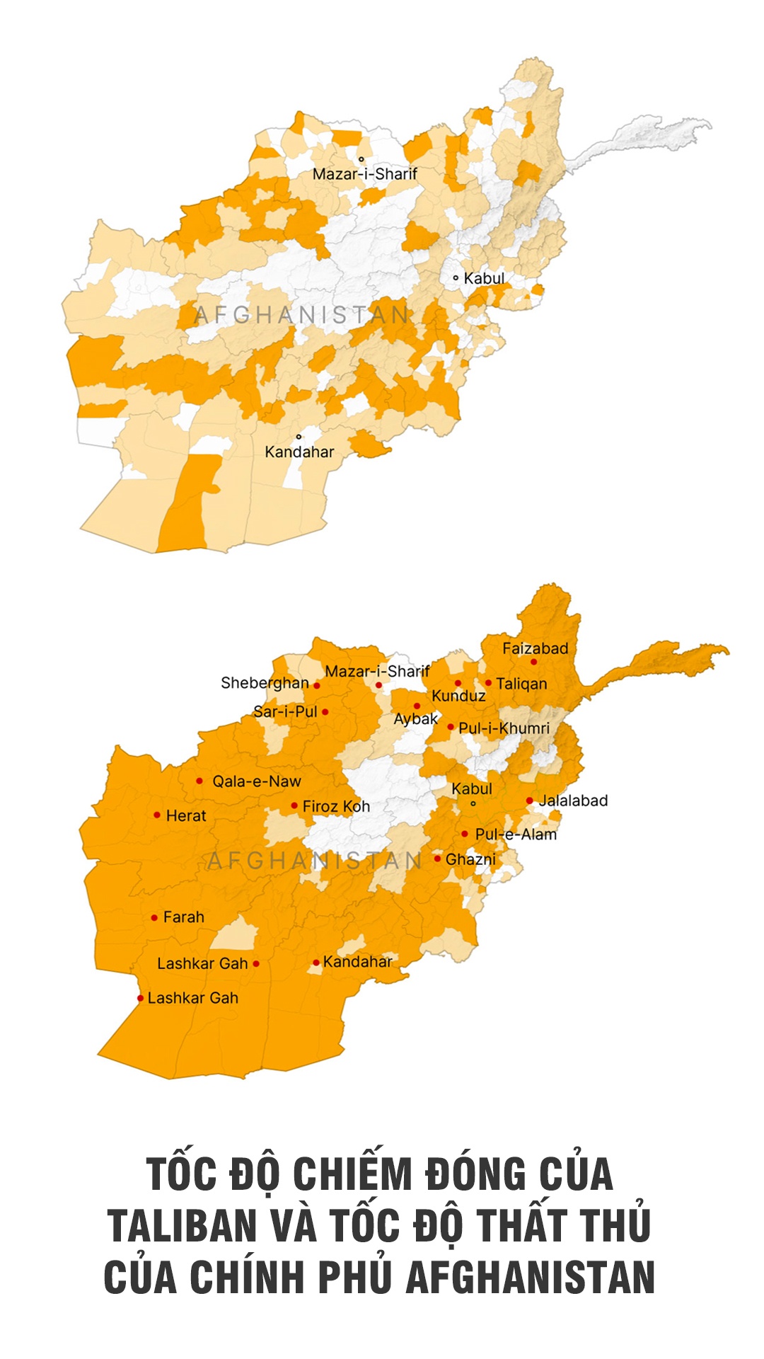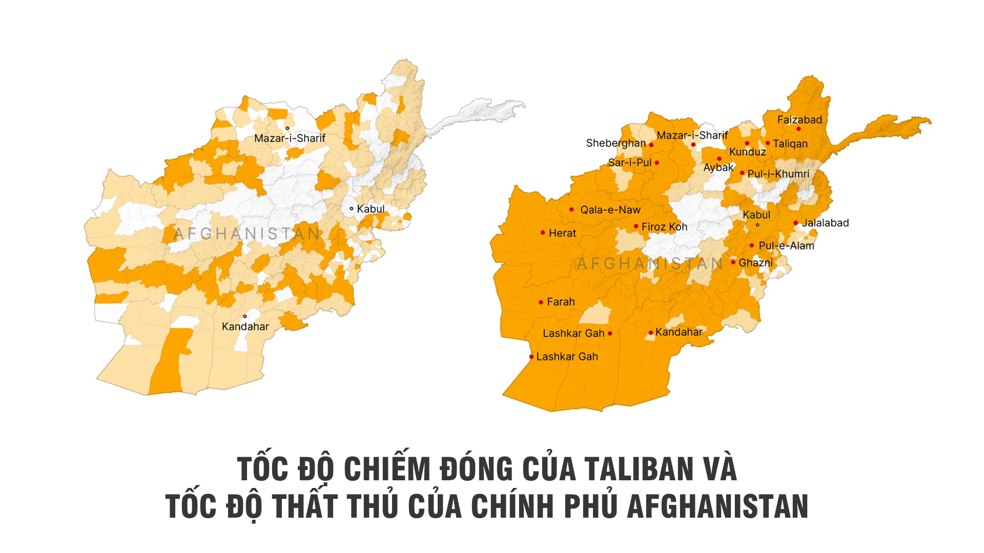 Chỉ sau hơn 2 tháng từ khi Mỹ bắt đầu rút quân, Taliban đã chiếm được gần như toàn bộ Afghanistan, bao gồm thủ đô Kabul. Riêng tuần cuối cùng, 14 thành phố lớn liên tiếp thất thủ.