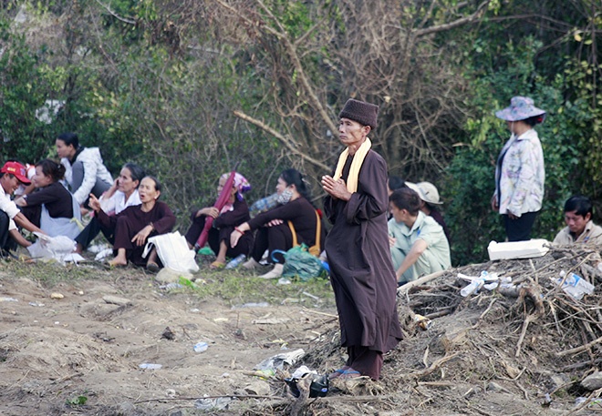 | Một nhà sư chắp tay cầu nguyện cho Đại tướng phía ngoài khu an táng. |