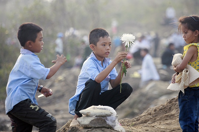 | Các em nhỏ xã Quảng Đông (nơi chôn cất Đại tướng) cầm những bông hoa cúc trắng trồng trên những cồn cát. |