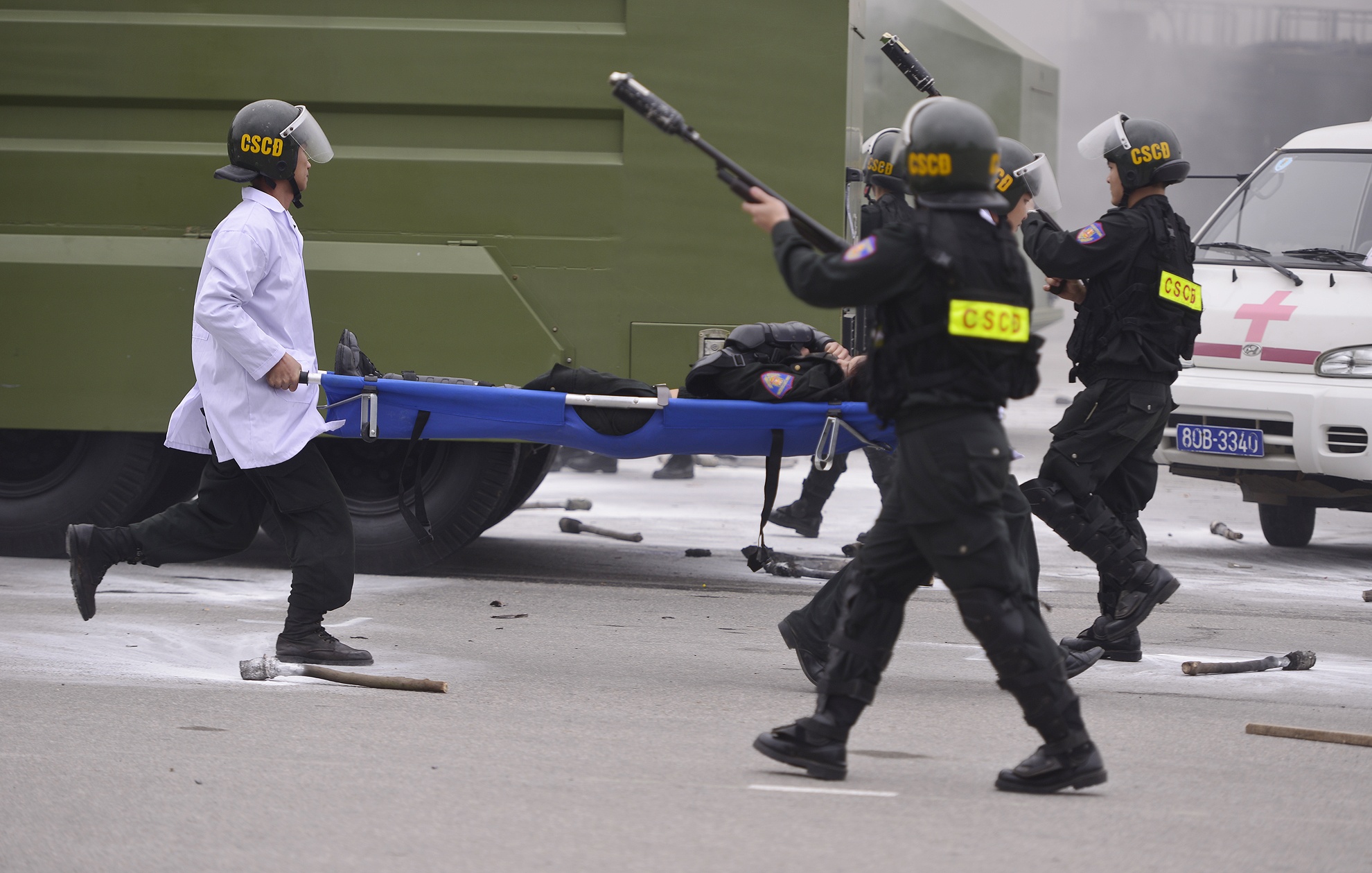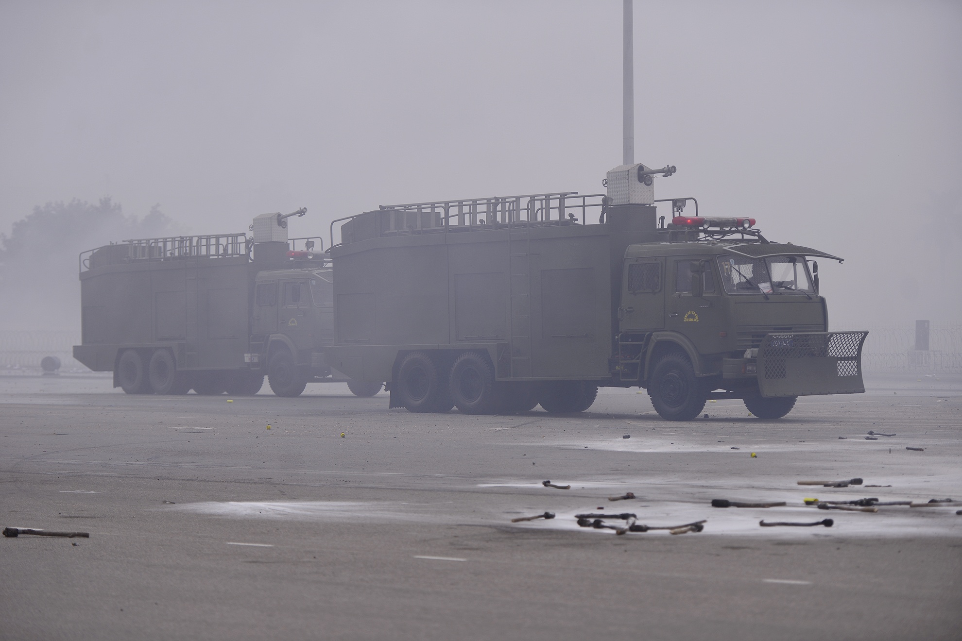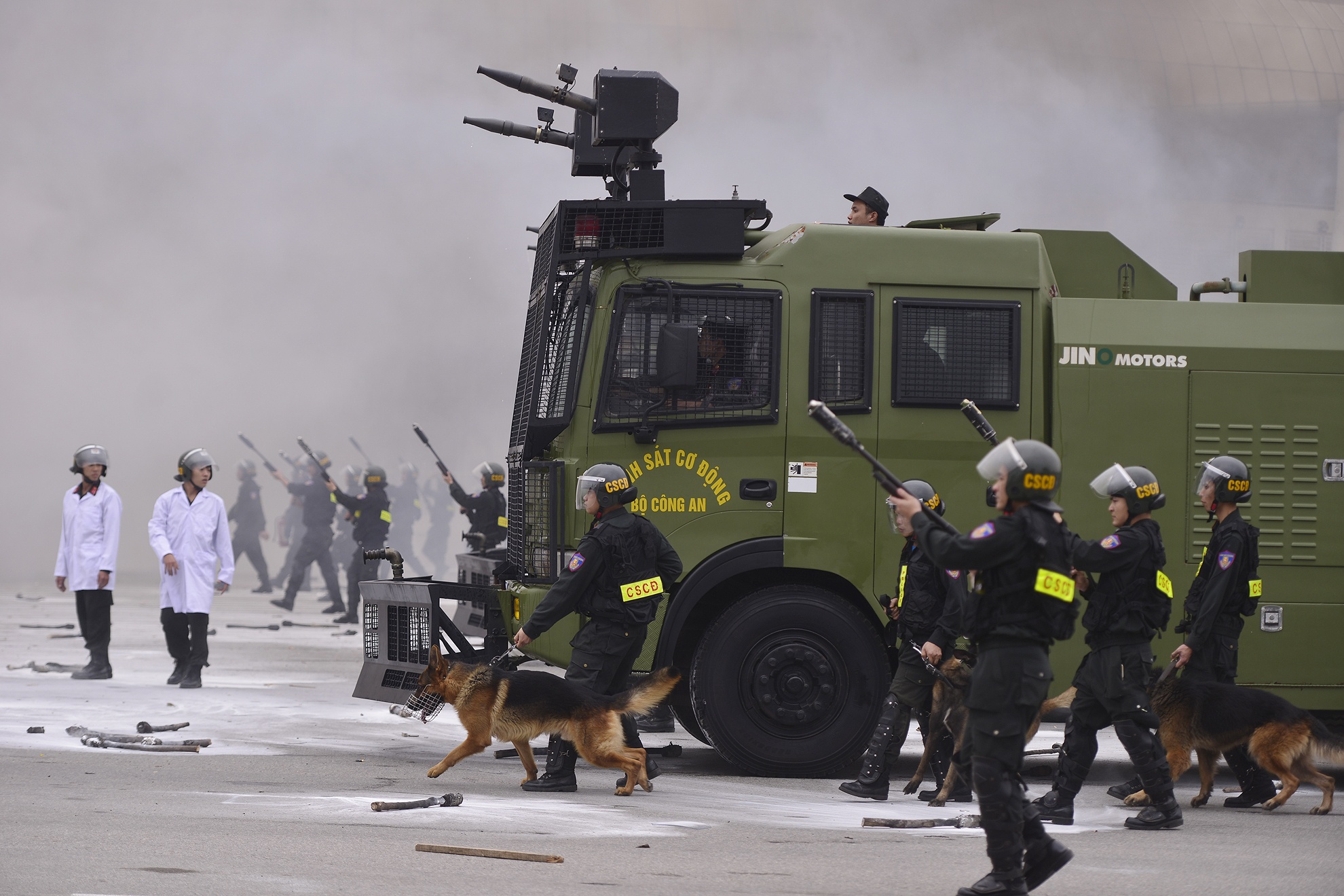 | Lực lượng chống bạo động phải huy động thêm chó nghiệp vụ và nhiều xe phun nước. |