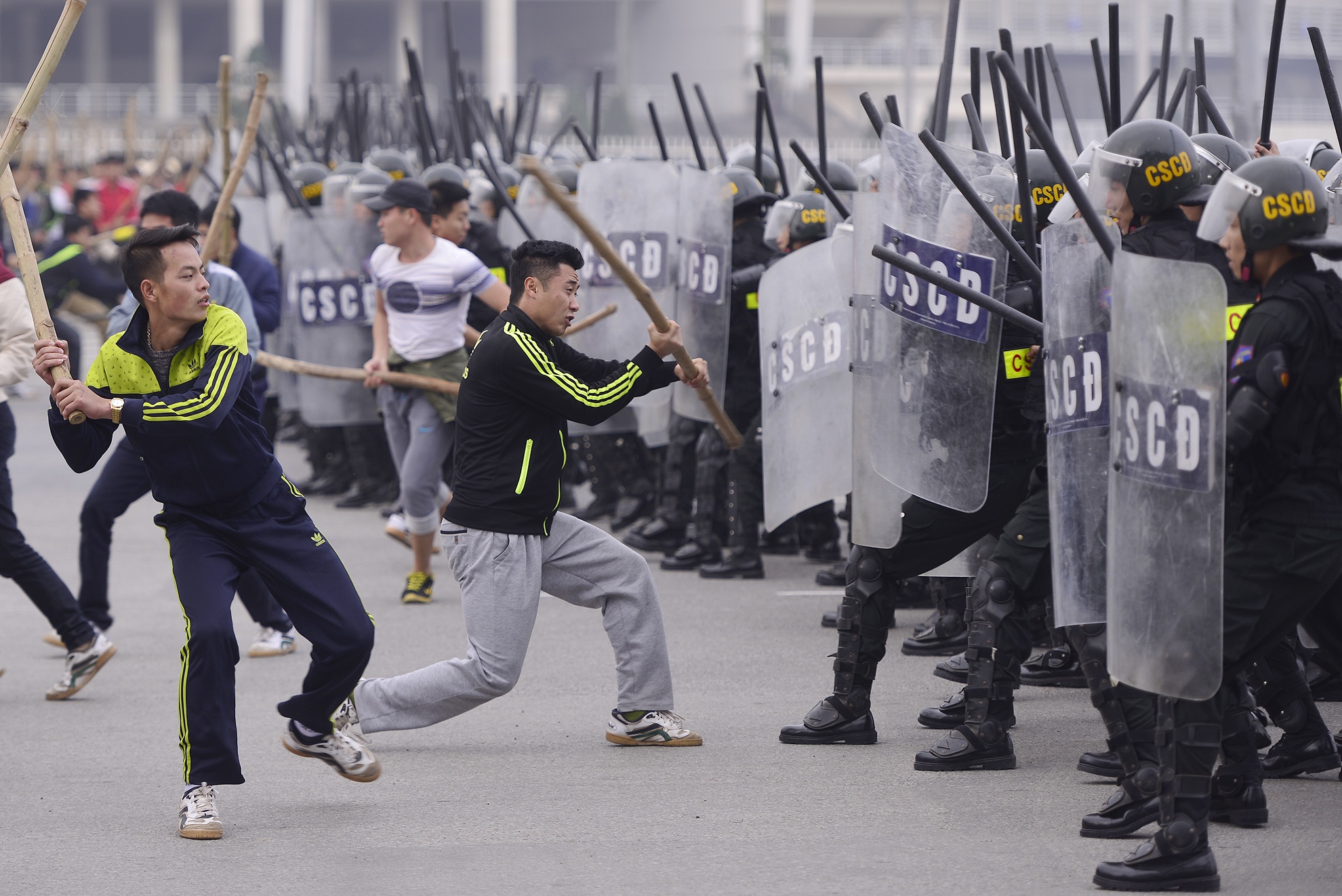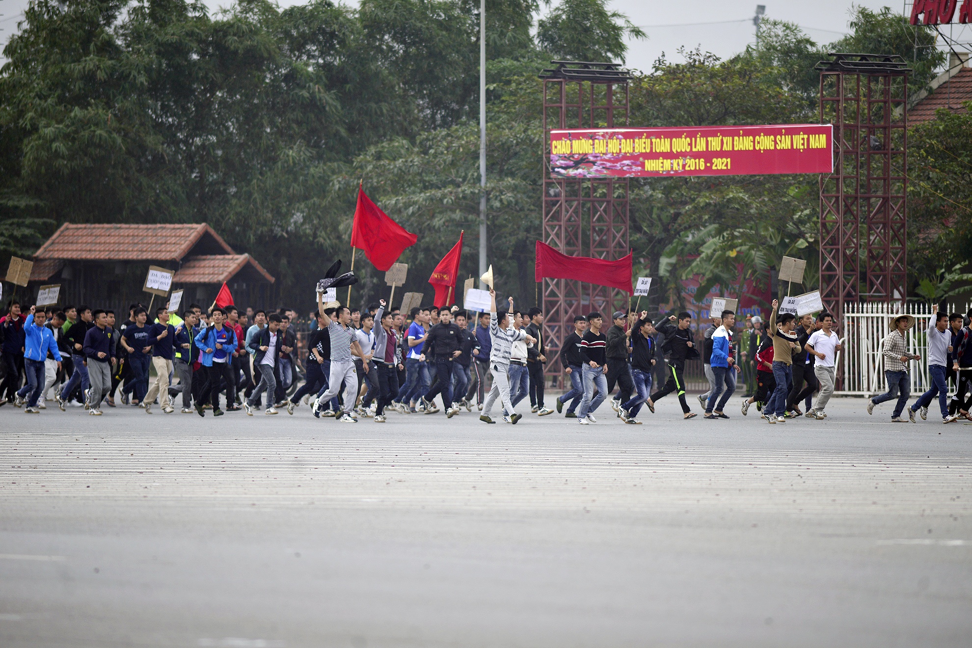 | Tại buổi xuất quân chính thức triển khai phương án bảo vệ Đại hội Đảng sáng 9/1, các lực lượng diễn tập tình huống giả định hàng trăm người kéo về UBND Thành phố Hà Nội biểu tình, đòi gặp lãnh đạo để ra yêu sách về vấn đề giải phóng mặt bằng. |