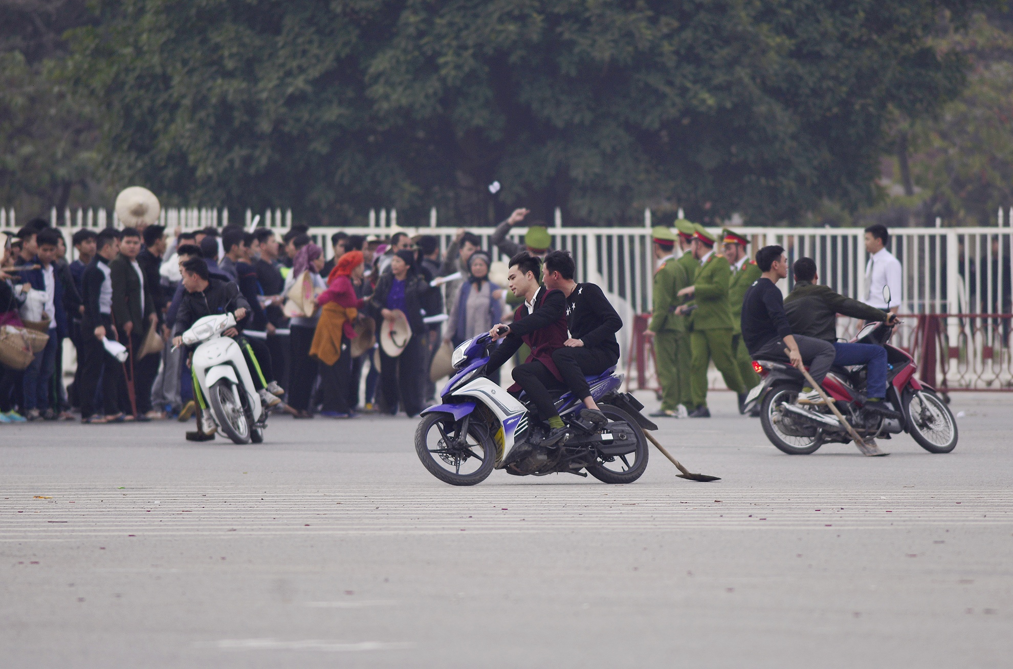 | Đám đông tại cổng UBND Thành phố giải tán tạm thời. Hàng nghìn người khác kéo từ Hưng Yên, Vĩnh Phúc lên gây rối loạn tại "Trung tâm hội nghị Quốc gia". |