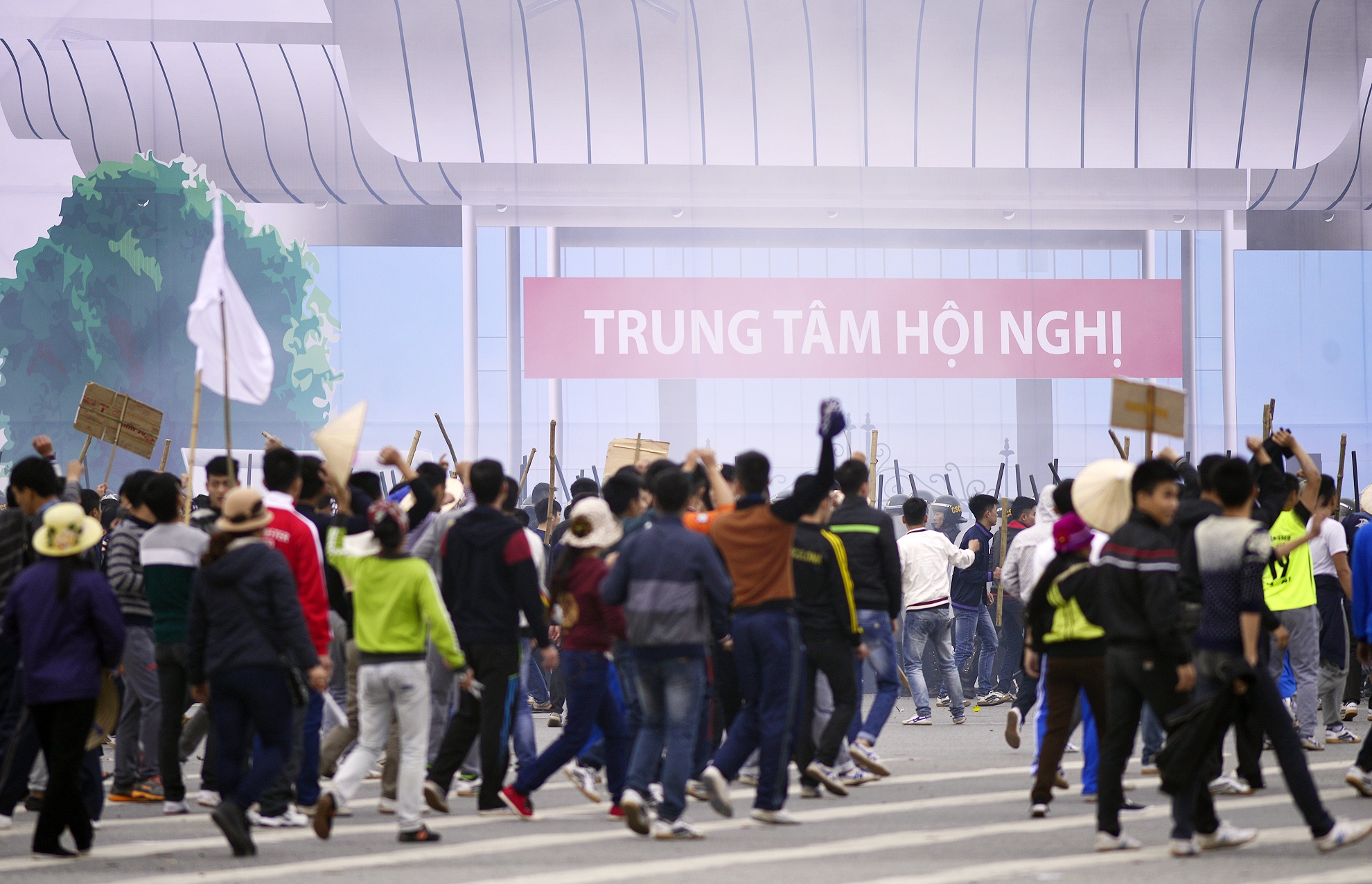 | Không lâu sau đó, hàng nghìn người khác từ các hướng kéo đến UBND TP và Trung tâm hội nghị Quốc gia mang theo lửa ném vào lực lượng cảnh sát. |