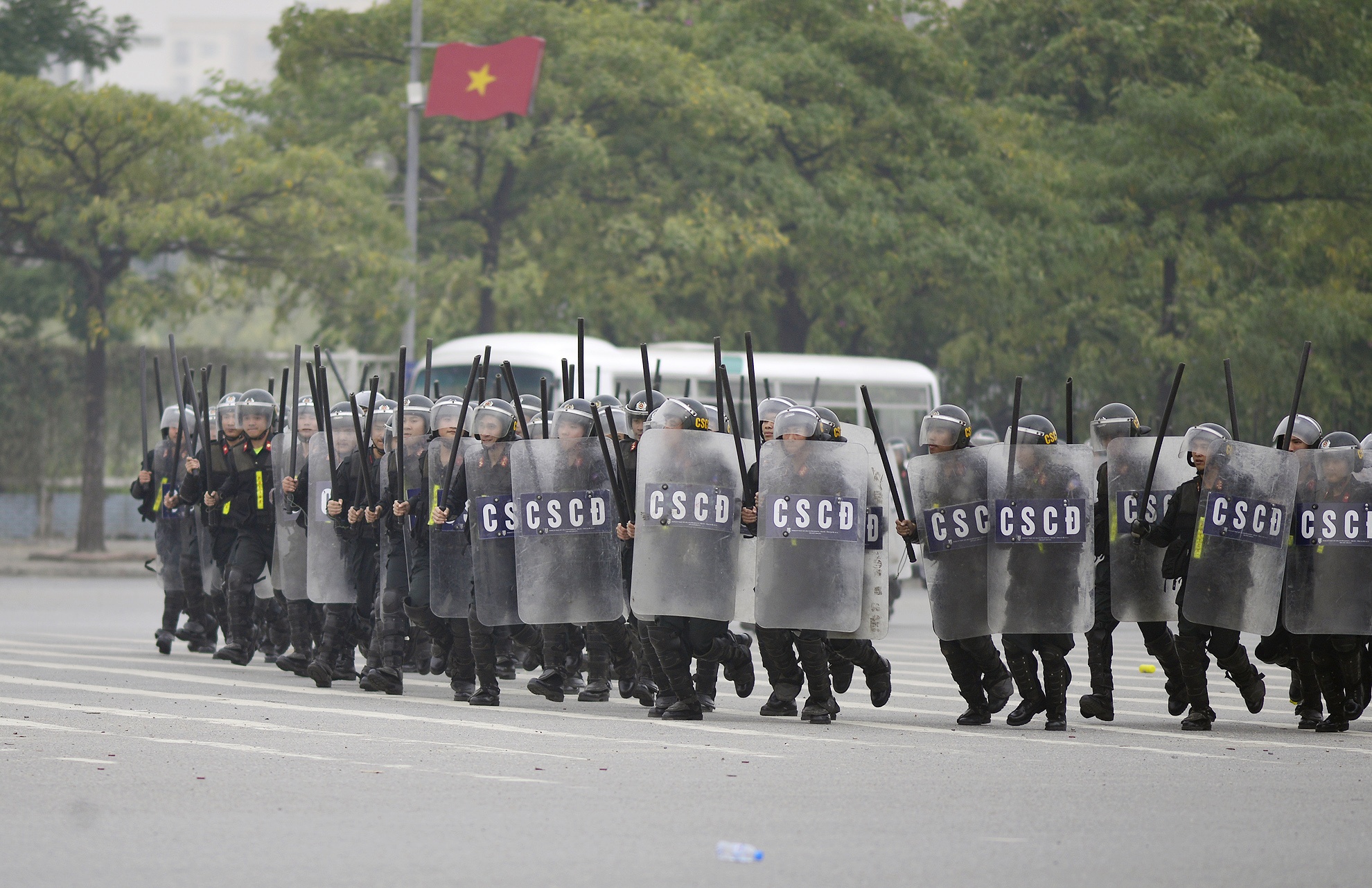 Buổi xuất quân triển khai phương án bảo vệ Đại hội Đảng với phần giả định giải tán đám đông, chống bạo động được thực hiện sáng 9/1, tại quảng trường Mỹ Đình (Hà Nội).