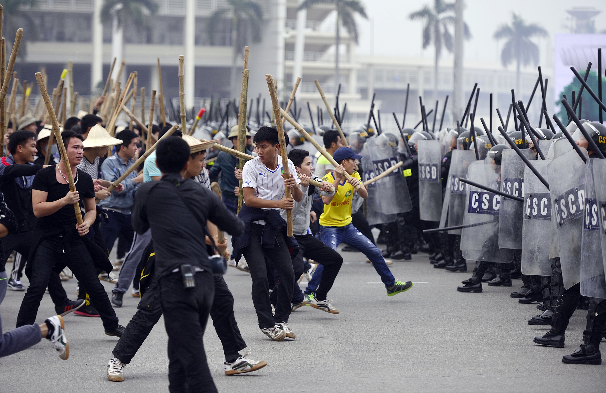 | Đám đông dùng gậy gộc va chạm mạnh với cảnh sát. |