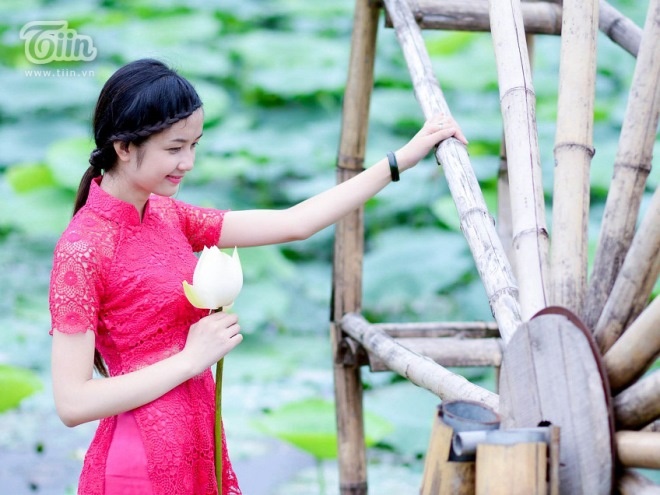 | Hình ảnh cô bạn trong trang phục áo dài đầy nữ tính bên hồ sen tạo được thiện cảm với người xem. |