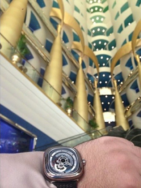 | Chiếc SevenFriday P3-2 phiên bản vỏ gỗ đặc biệt được khoe khéo trong khuôn viên khu Buji Alarab - khách sạn sang trọng nhất thế giới hiện nay. |