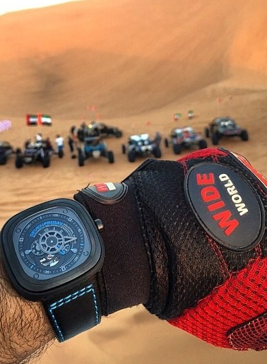 Thương hiệu này cũng thường xuyên có mặt trong các cuộc gặp gỡ của Dubai Super Car Club. Đây là hình ảnh của một trong những thành viên câu lạc bộ này tham gia cuộc Desert Run (đua trên sa mạc) tổ chức nhiều lần trong năm. Trên hình là chiếc SevenFriday Prior Court phiên bản giới hạn. Cũng tại buổi đấu giá từ thiện tại London vài tháng trước, chiếc SevenFriday Prior Court số 1/100 đã được một vị khách hàng hào phóng người Arab đấu giá tới mức 65.000 bảng Anh.