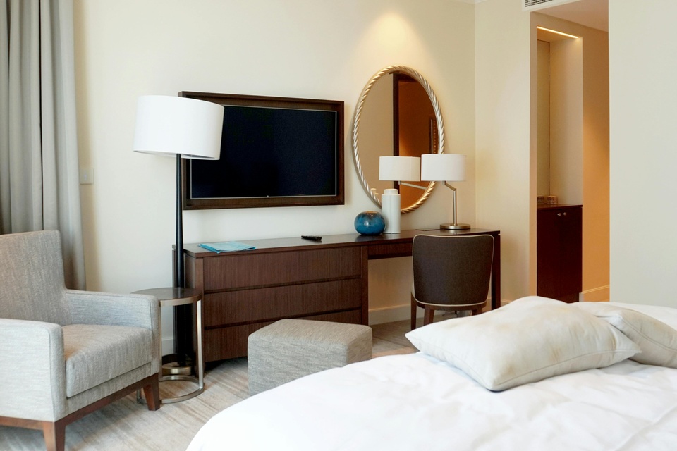 Hơn nữa, chuẩn thiết kế hiện đại còn xem tivi là một phần trong tổng thể “zona giải trí và nghỉ ngơi” của phòng. Khi tivi được bố trí đối diện giường, không gian nghỉ ngơi vừa mang tính thẩm mỹ cao vừa thuận tiện cho thao tác điều khiển từ xa, mở rộng lựa chọn xem phim, truyền hình hay các dịch vụ giải trí tích hợp sẵn trên màn hình, vốn đang trở nên phổ biến hơn trong các phòng khách sạn cao cấp.
