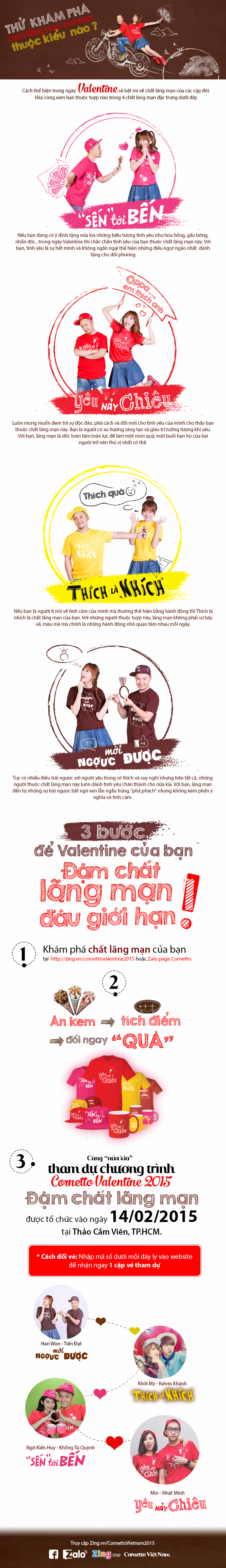 Ngoài ra, các hoạt động hấp dẫn tại trang mạng xã hội Facebook và Zing Me cũng tạo cơ hội giúp các cặp đôi nhận vé đến với sự kiện Valentine lãng mạn nhất trong năm đến từ Cornetto.