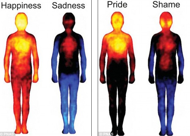 Sự trầm cảm khiến cơ thể trở nên yếu hơn, trong khi cảm giác kinh tởm tác động tới họng và ruột, khiến con người buồn nôn. Cảm giác xấu hổ tác động mạnh tới vùng mặt, còn cảm giác tự hào khiến vùng đầu và ngực trở nên ấm hơn.