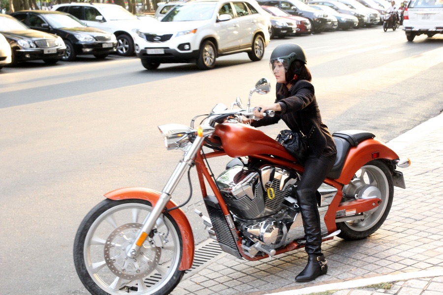 | Sau khi tham dự sự kiện, Tinna Tình ngồi trên chiếc xe mô tô để chạy về. Hình ảnh nữ nghệ sĩ lái xe máy trên phố thu hút sự quan tâm của nhiều người đi đường. |