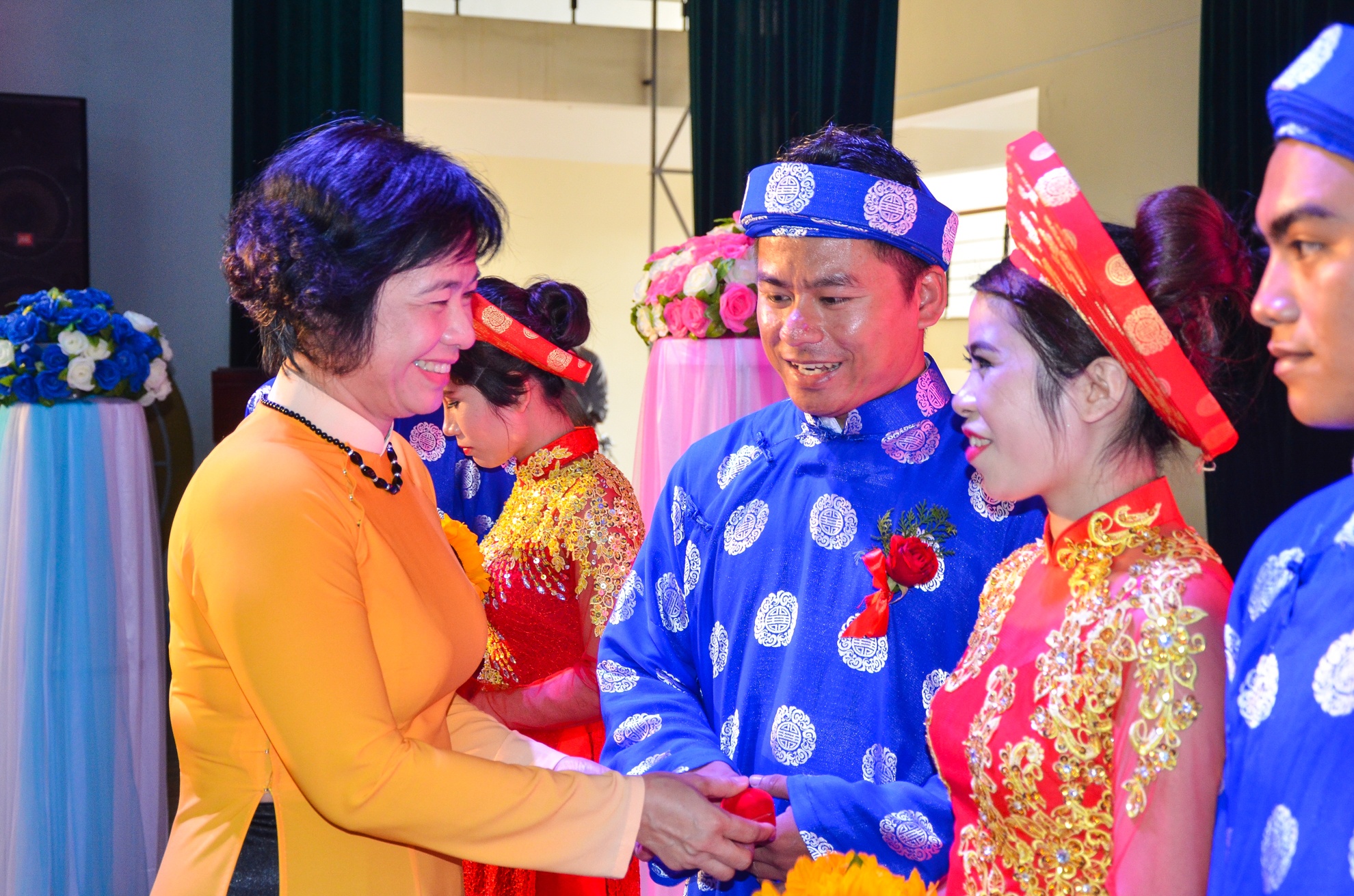| Bà Đặng Thị Kim Liên trao nhẫn cưới cho các cô dâu, chú rể. Ảnh: Đoàn Nguyên. |