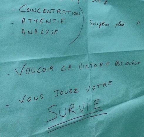 | Một góc thông tin ông Graechen viết bằng tiếng Pháp trong phòng thay đồ của HAGL. Concentration (tập trung), attentif (chú ý), analyse (phân tích) lối chơi của đối thủ. Và từ quan trọng nhất được viết gạch chân là "survie" - sự sống còn. |