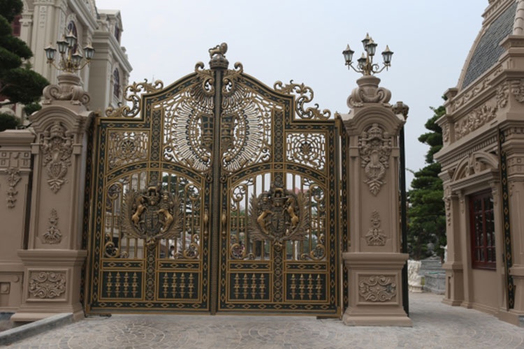 | Cánh cổng màu đồng của lâu đài được trang trí hình ngựa và sư tử. |