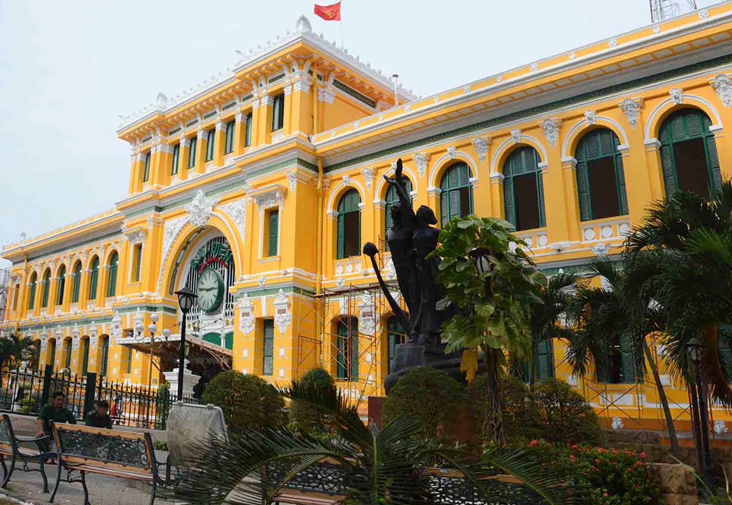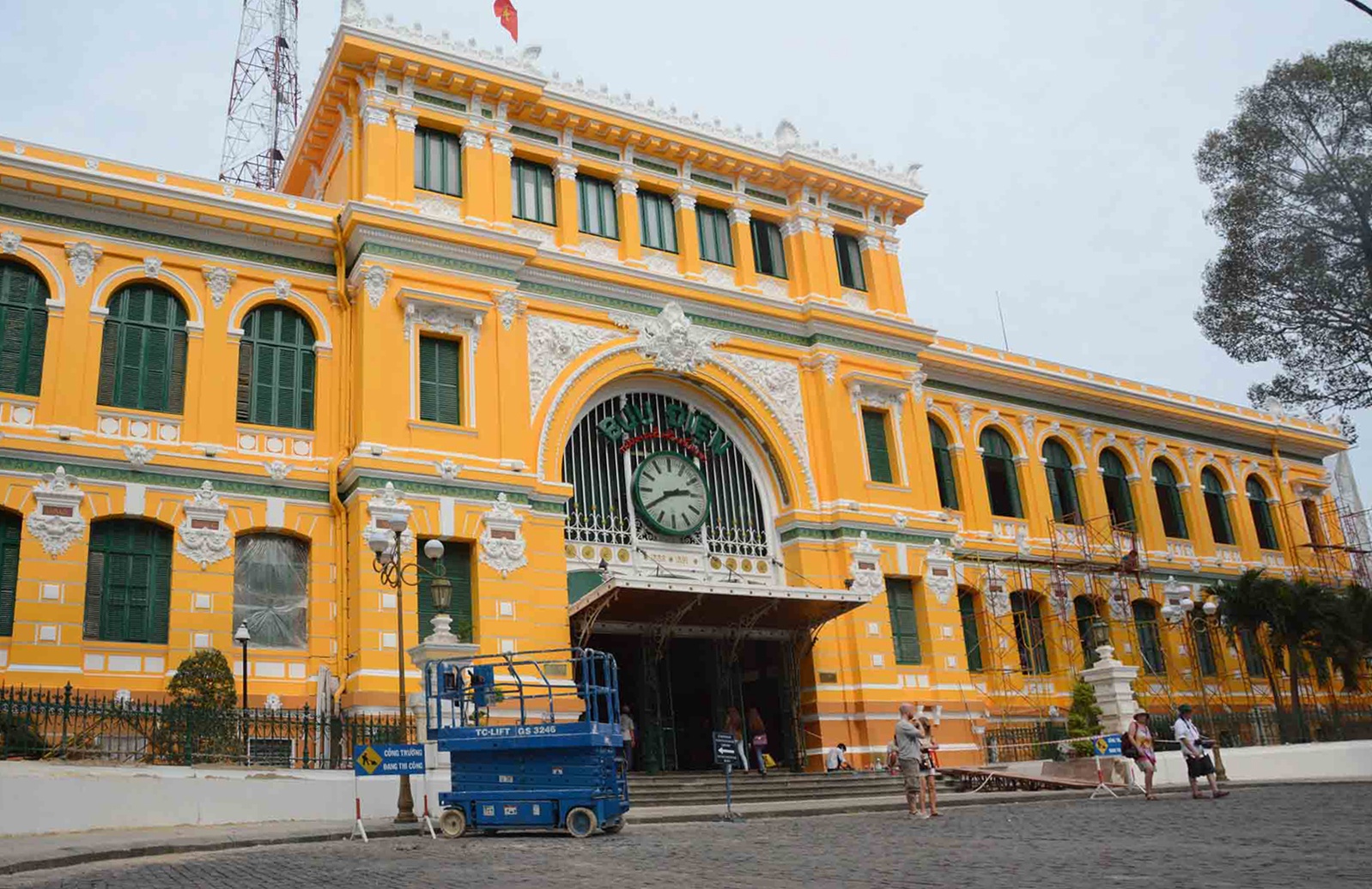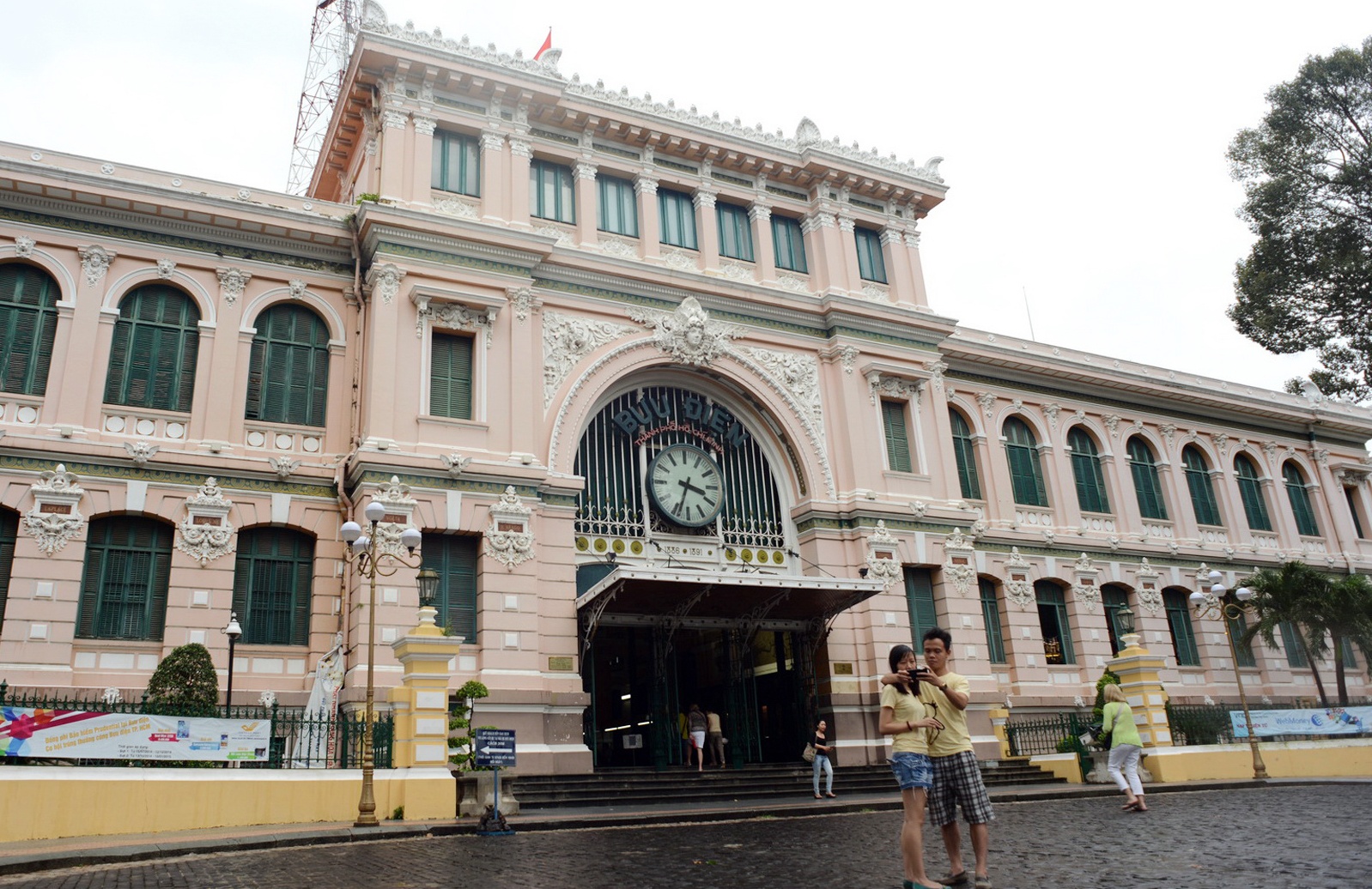 | Bưu điện TP.HCM (được xây dựng từ năm 1891), là một trong những công trình biểu tượng về kiến trúc của thành phố. Đây là điểm làm dịch vụ thư tín và tham quan hàng ngày của người dân và du khách trong và ngoài nước. Tòa nhà đang được "thay áo" mới bằng màu vàng chói và vấp phải phản ứng của dư luận cũng như giới chuyên môn. Ảnh: Hải An - Lê Quân. |