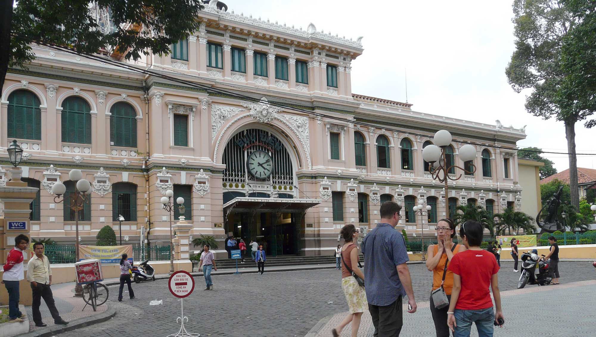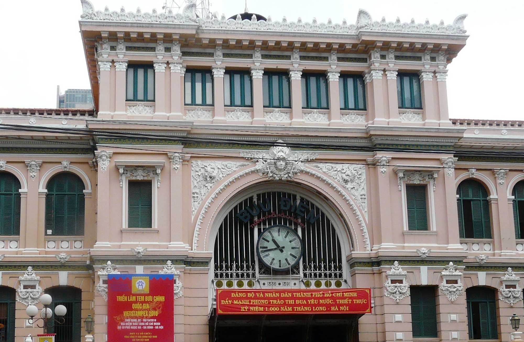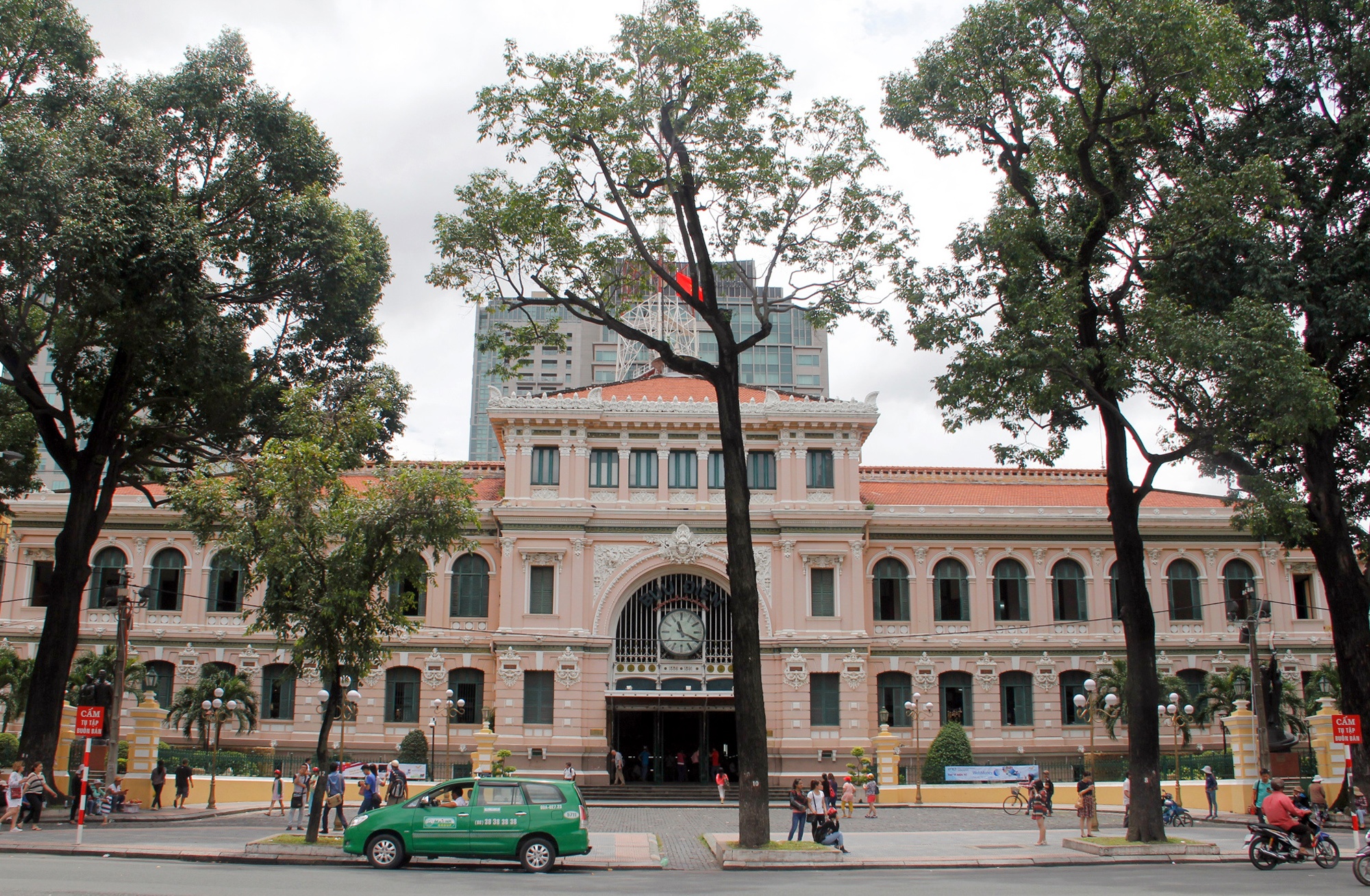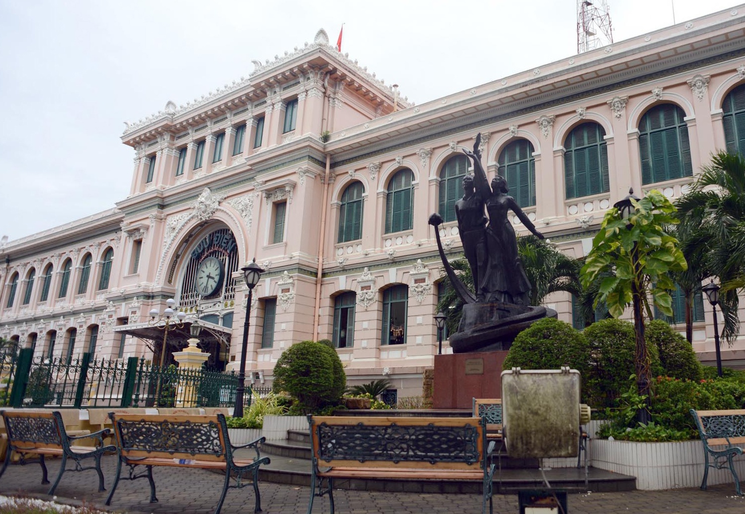 | Bưu điện TP.HCM (được xây dựng từ năm 1891), là một trong những công trình biểu tượng về kiến trúc của thành phố. Đây là điểm làm dịch vụ thư tín và tham quan hàng ngày của người dân và du khách trong và ngoài nước. Tòa nhà đang được "thay áo" mới bằng màu vàng chói và vấp phải phản ứng của dư luận cũng như giới chuyên môn. Ảnh: Hải An - Lê Quân. |