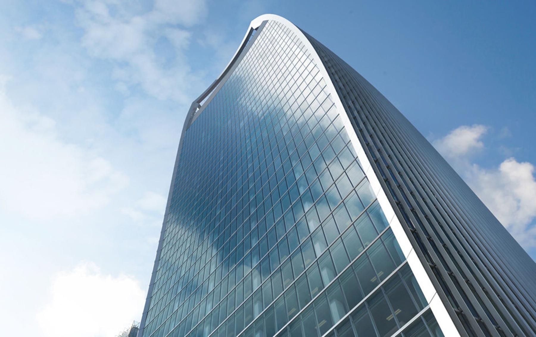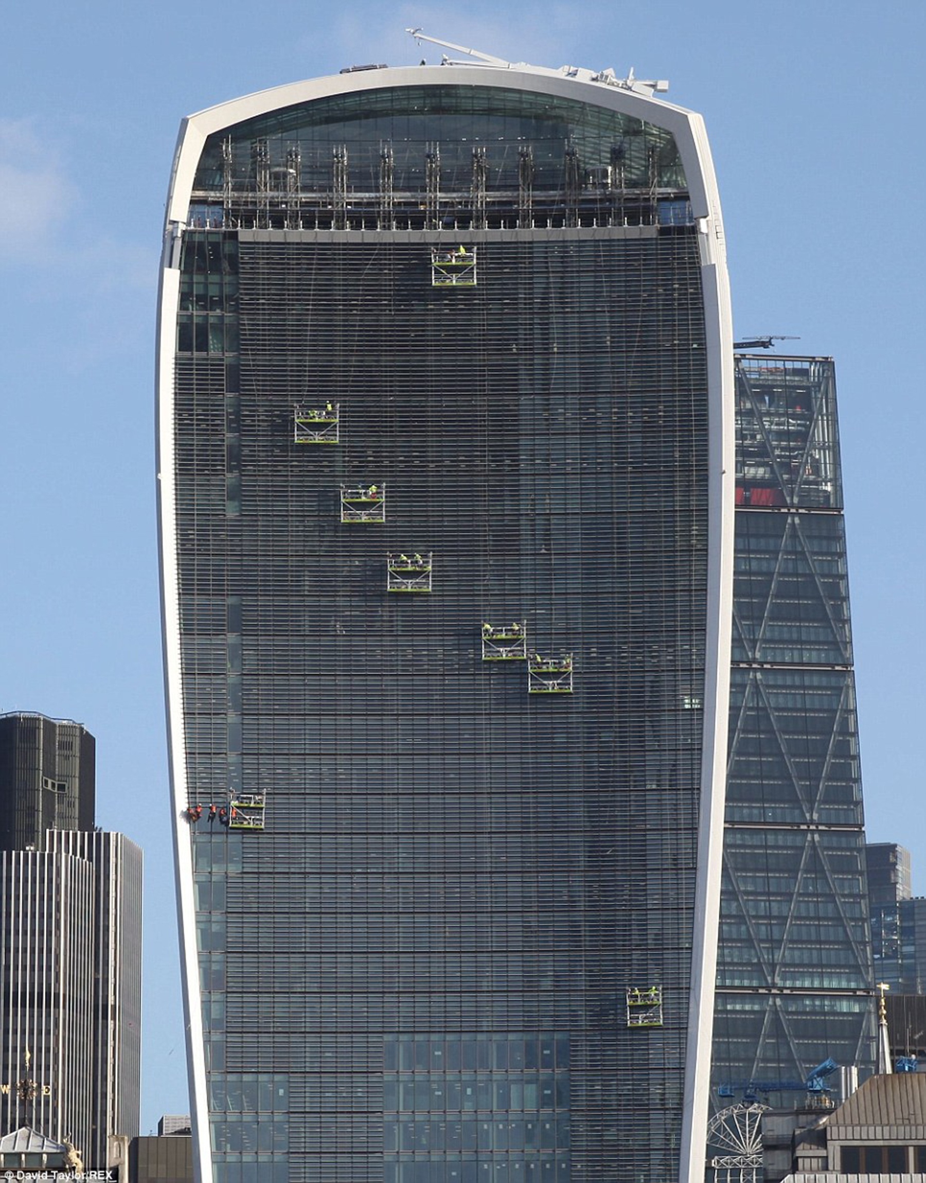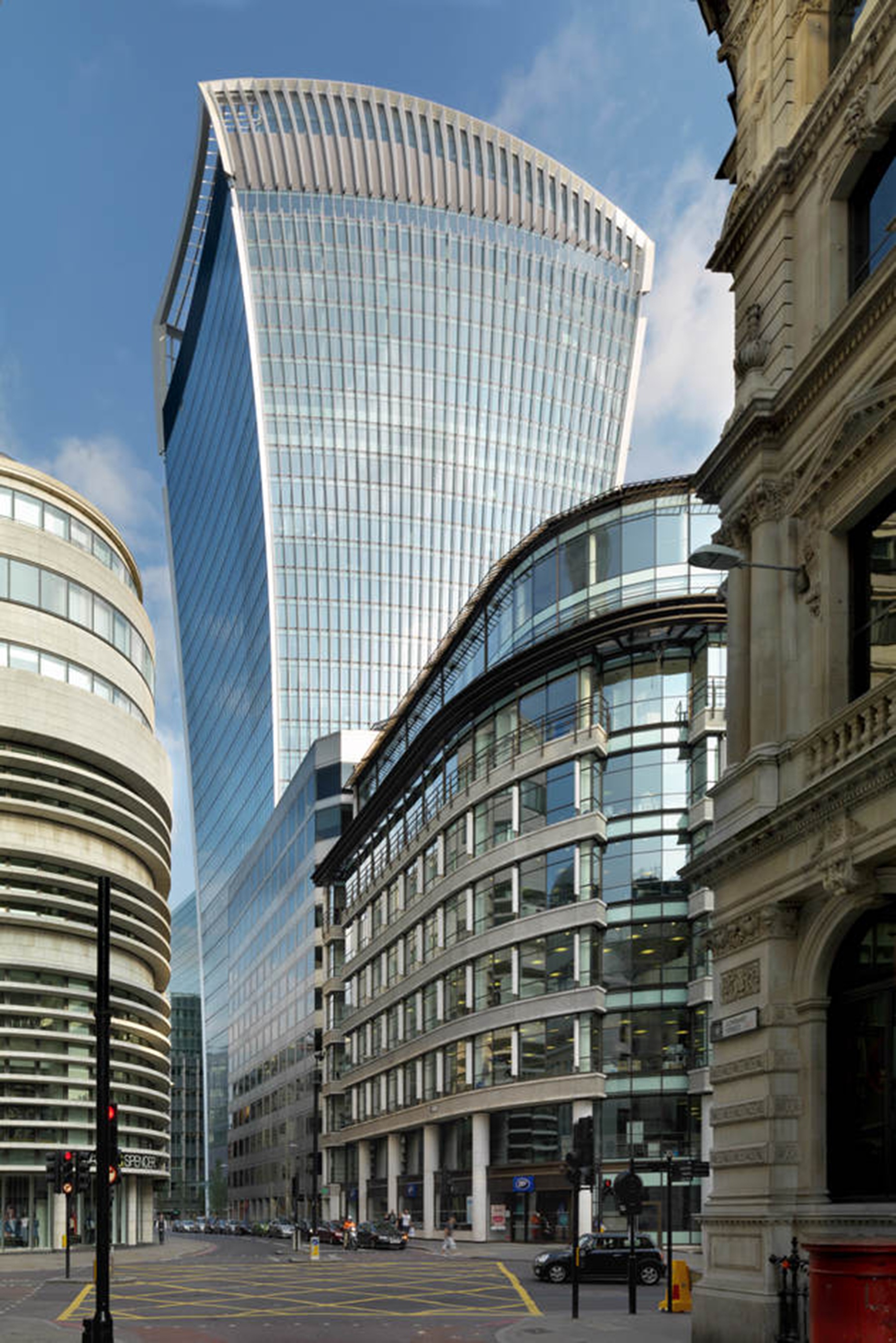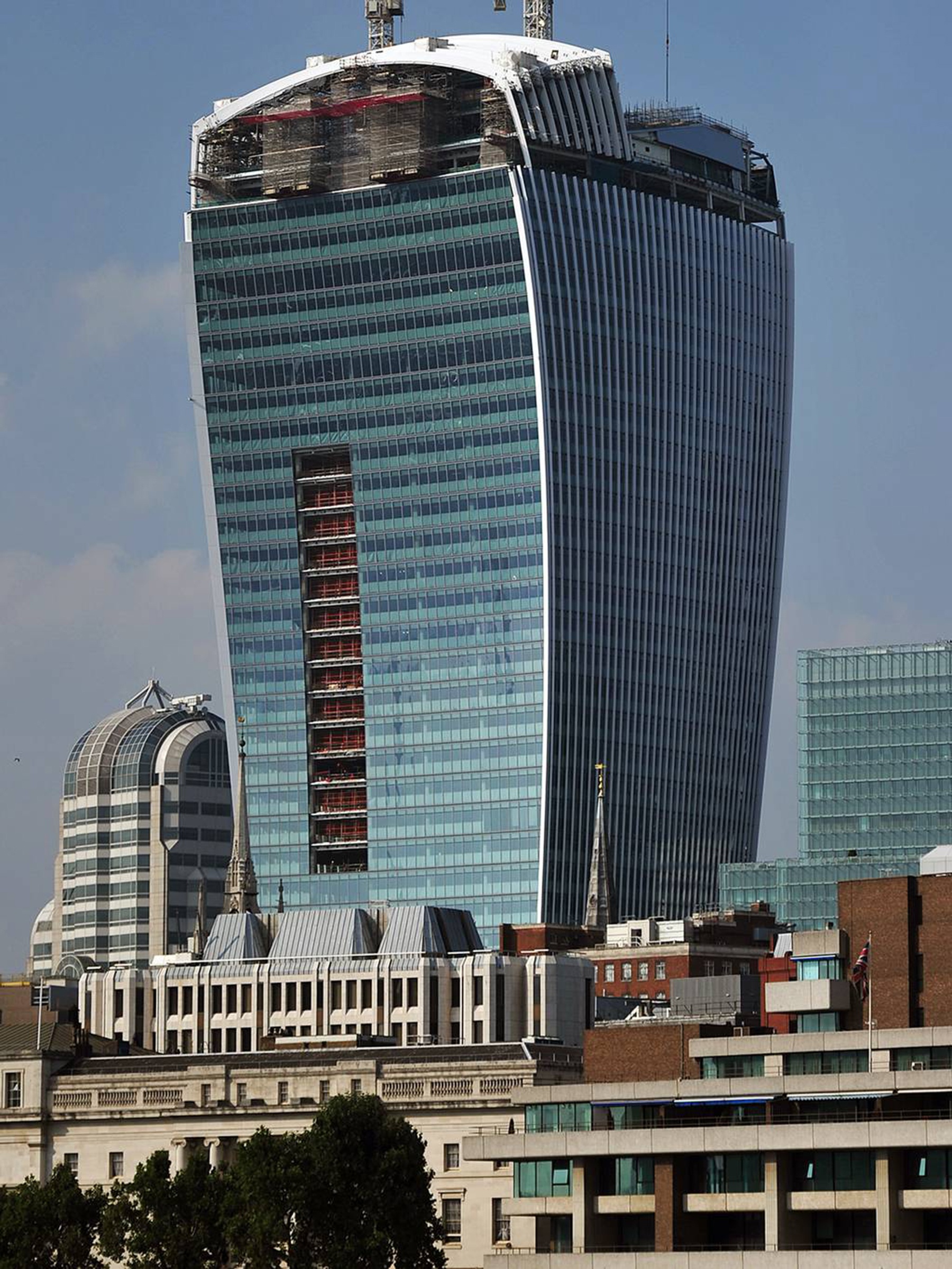 Công trình này được thiết kế cong bốn mặt, sử dụng kính phủ toàn bộ bề mặt bên ngoài. Không giống những tòa nhà chọc trời thông thường, càng lên cao, tòa nhà càng phình to nhằm tối đa hóa không gian ở các tầng trên. Ảnh: independent.co.uk. |