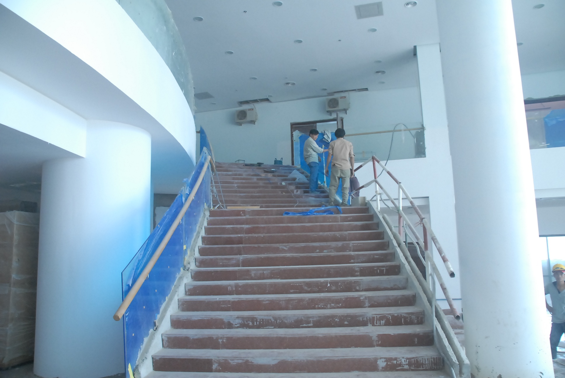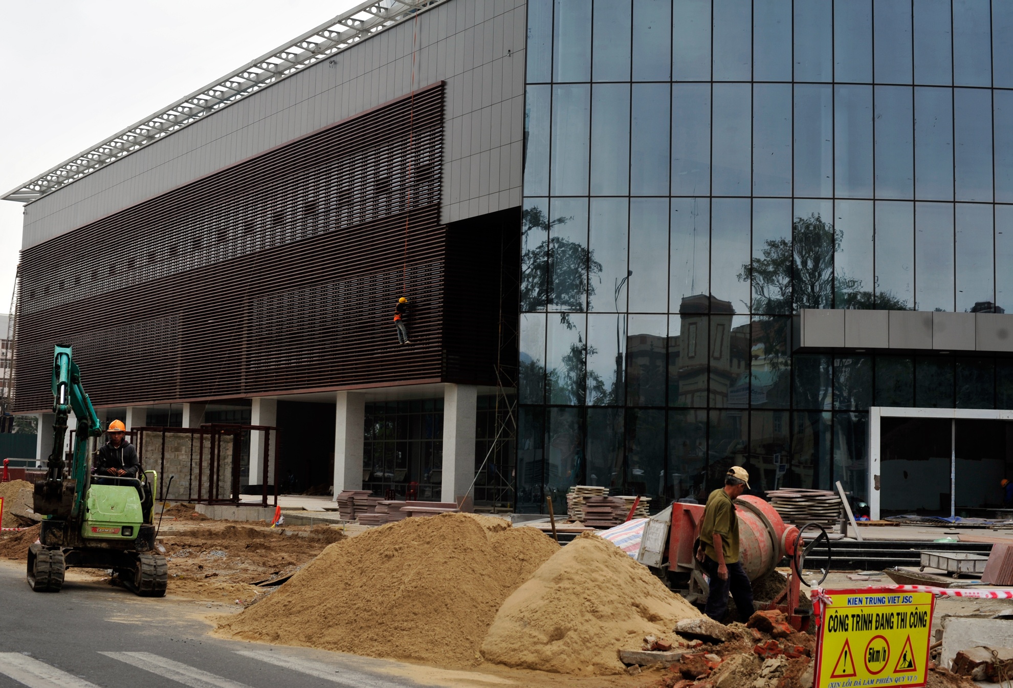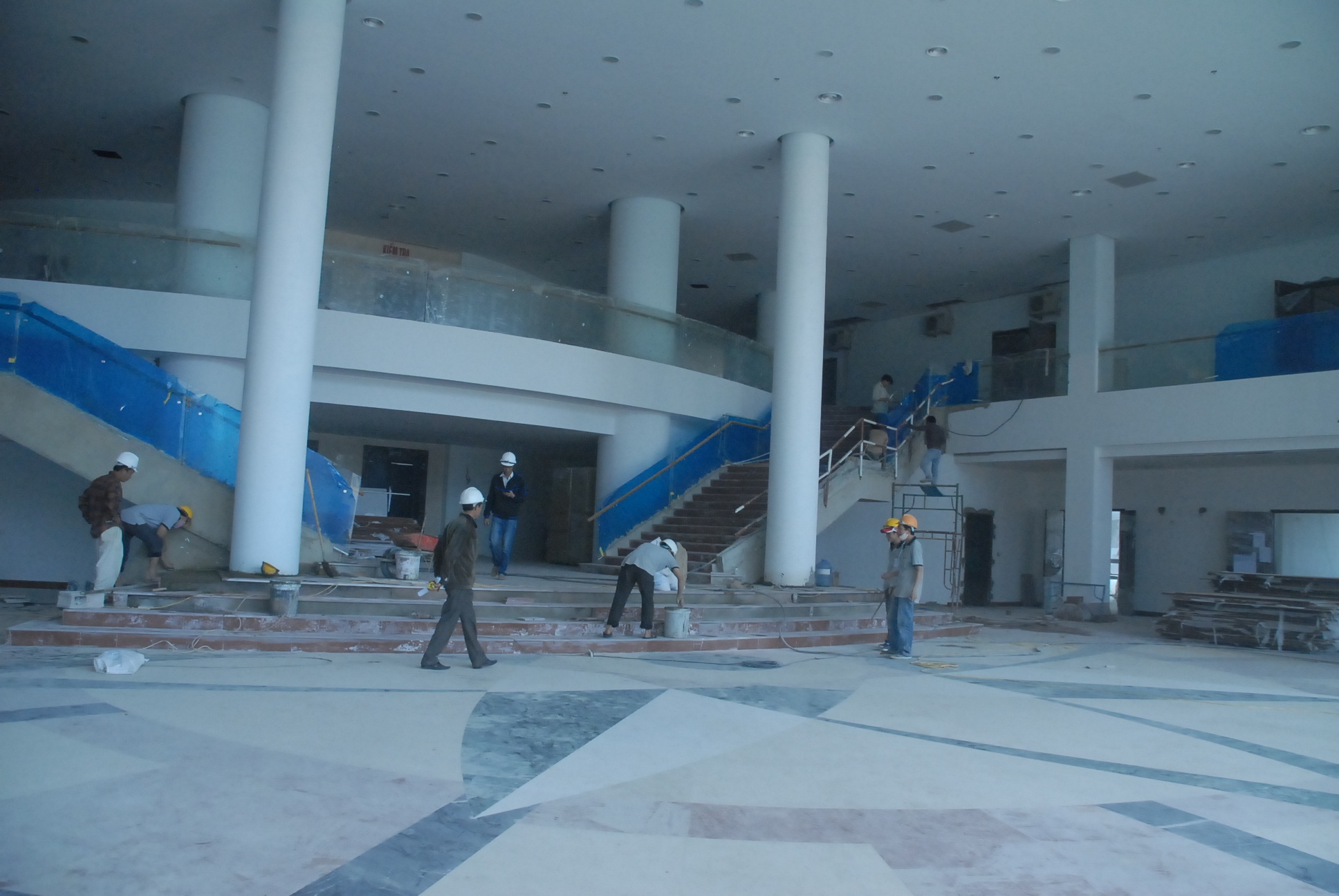 Bên ngoài tòa nhà, từng tốp công nhân đang san đất, lót đá các bậc tam cấp, khuôn viên.