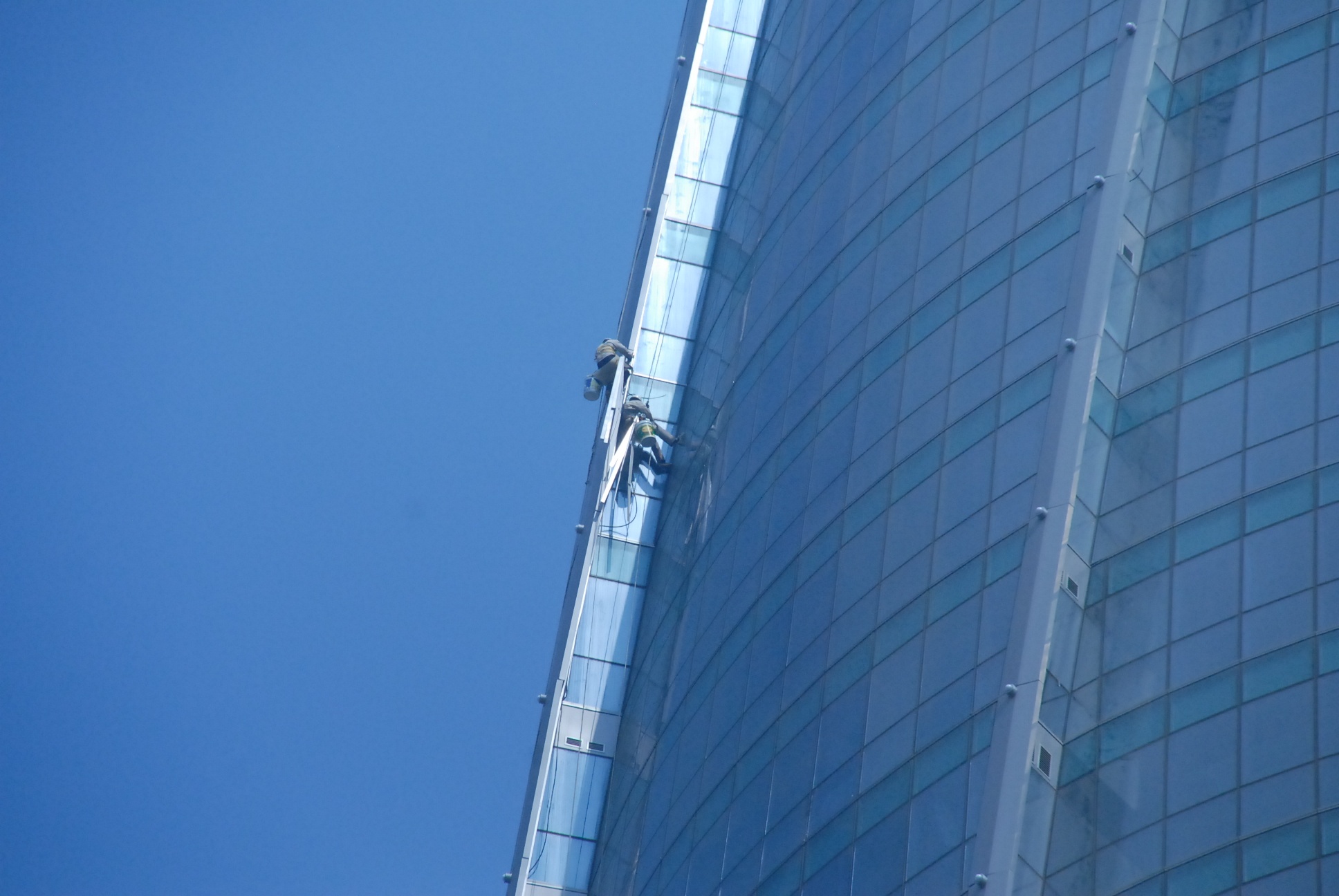 Một công việc được đánh giá là khó nữa là liên kết lớp kính bên ngoài. Tòa nhà có hình tròn nên ô kính bị chia nhỏ, hơn nữa để ghép kính người thợ phải chơi vơi giữa không trung mà không có điểm tựa như những công trình khác. Trong ảnh: Các công nhân hoàn thiện những công đoạn cuối cùng.