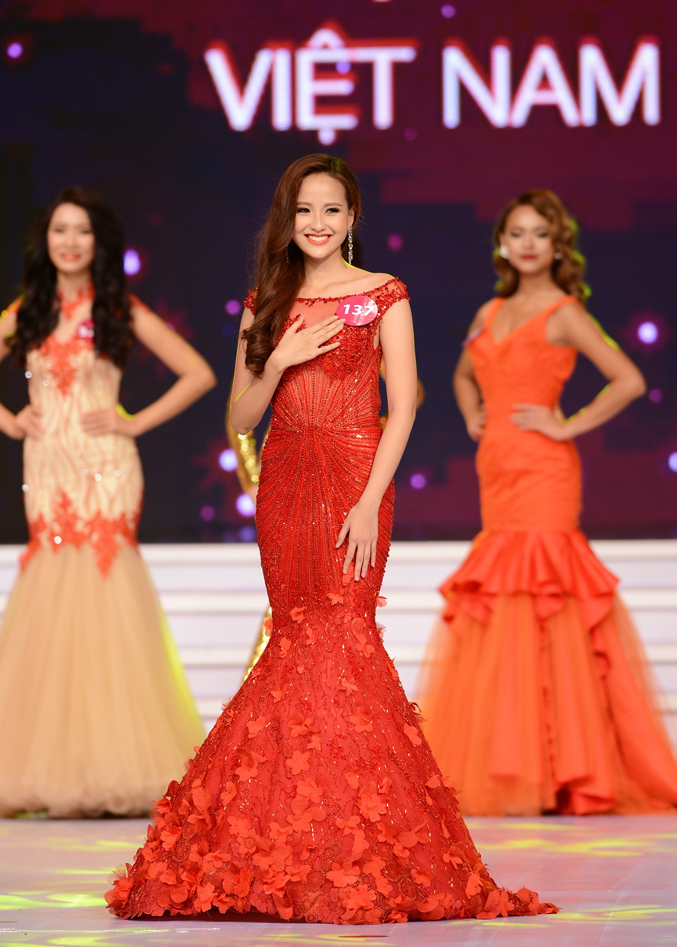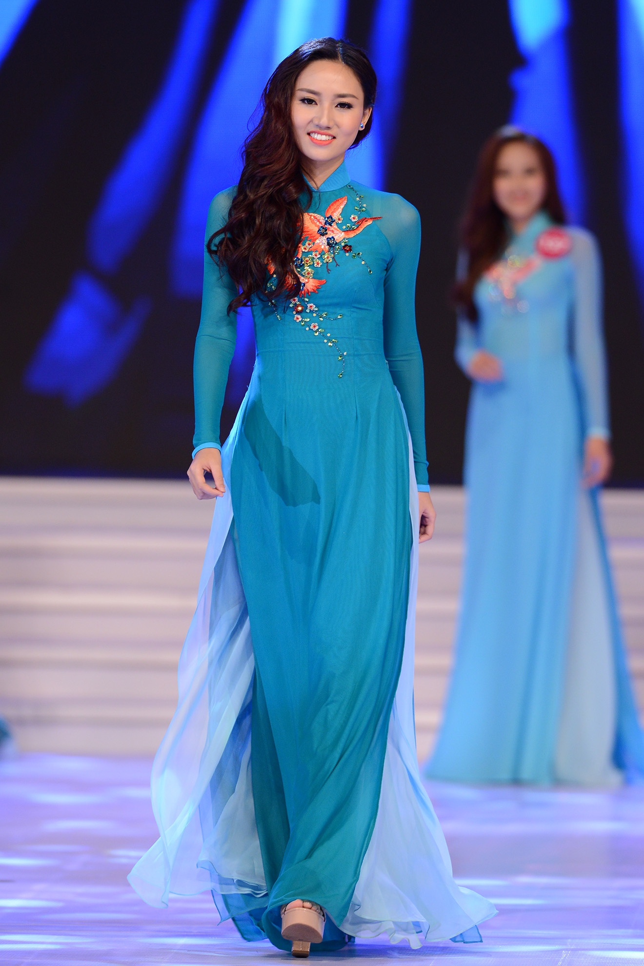 | Phần thi đầu tiên của đêm chung kết, các người đẹp lần lượt khoe dáng thướt tha trên sân khấu với tà áo dài mang chủ đề Hồng hạc của nhà thiết kế Võ Việt Chung. Sau phần trình diễn này BGK chọn ra các thí sinh vào top 15. |