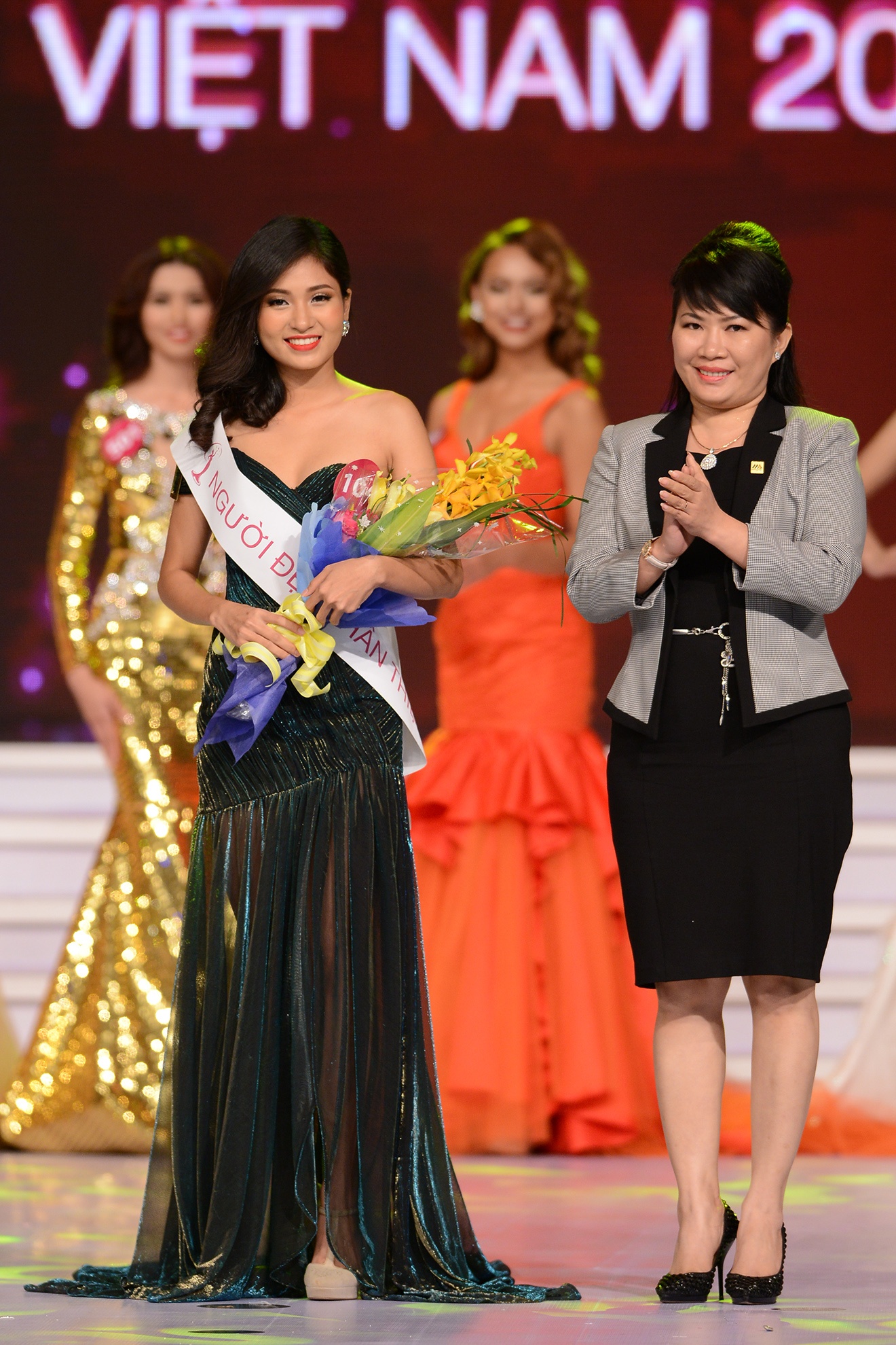 | Người đẹp Hải Phòng không giấu được nụ cười sướng và nét mặt xúc động. Thuỳ Lâm - Hoa hậu HVVN 2008 lên trao giải cho người kế nhiệm sau 7 năm. |
