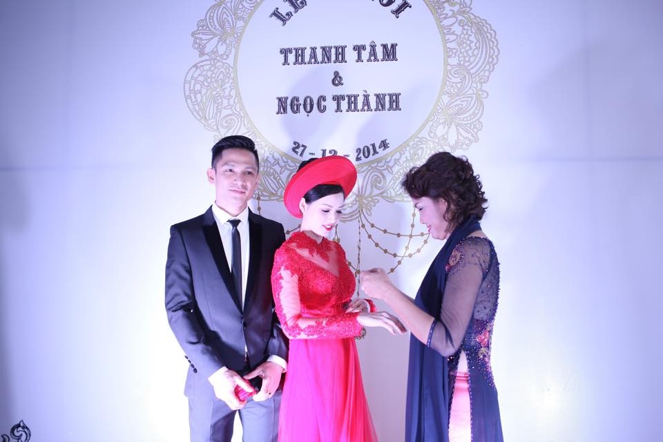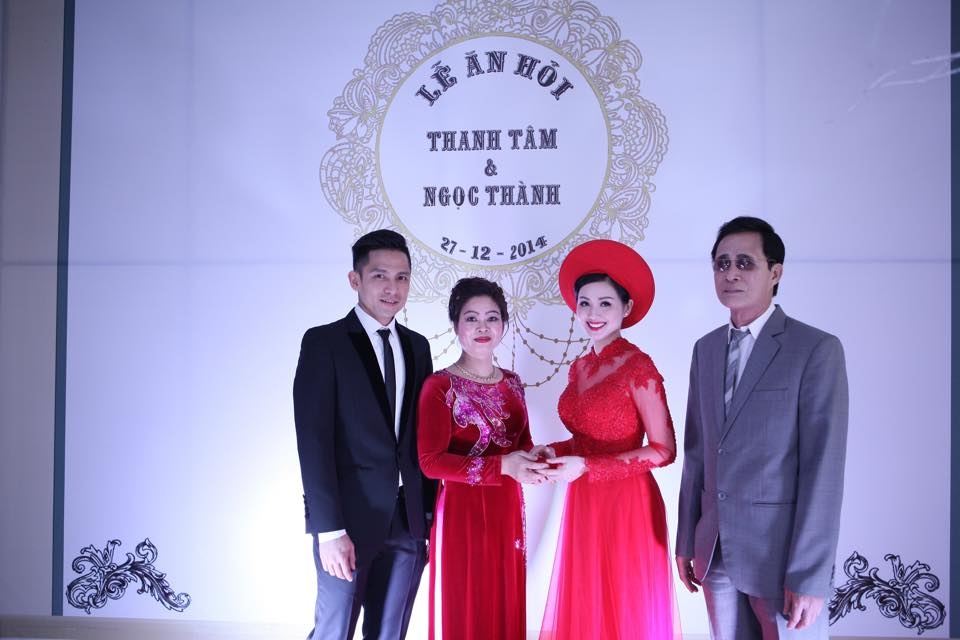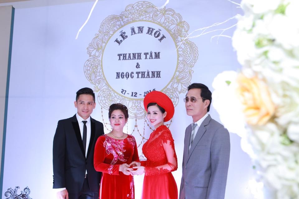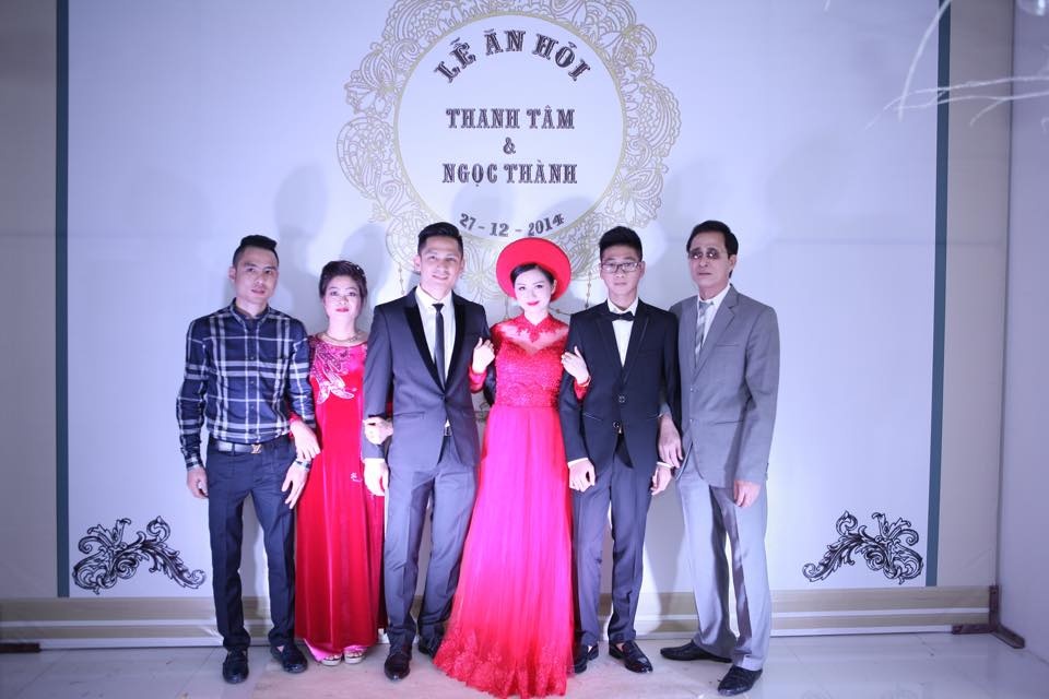 | Vợ chồng Tâm Tít hạnh phúc bên người thân. Lễ cưới của cô sẽ tổ chức tại khách sạn sang trọng vào ngày 10/1 tại Hà Nội. |