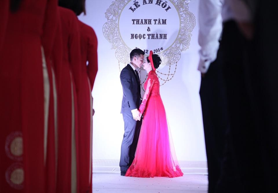 | Tâm Tít và ông xã thoải mái thể hiện tình cảm trong đám hỏi, trước sự chứng kiến của gia đình hai phía và bạn bè. Hai người quen biết nhau đã lâu nhưng chính thức yêu nhau từ tháng 10/2014. Sau 3 tháng hẹn hò, họ quyết định đi tới hôn nhân. |