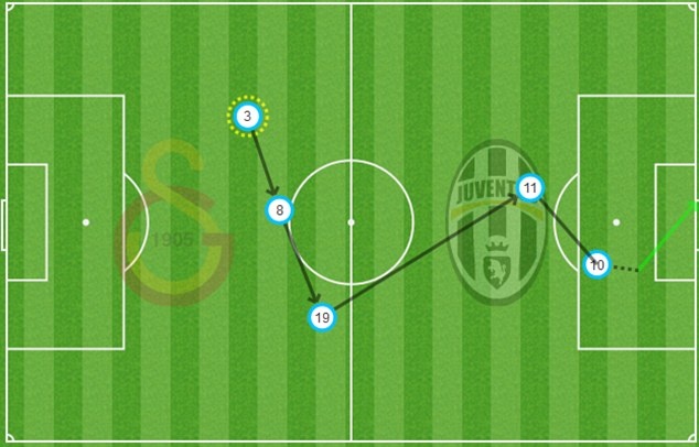 | Sơ đồ mô tả tình huống dẫn đến bàn thắng của cựu tiền vệ Inter Milan. |