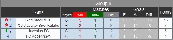 | Với 7 điểm sau 6 vòng (nhiều hơn Juve 1 điểm), Galatasaray chính thức giành quyền vào vòng knock-out. |