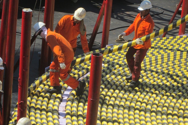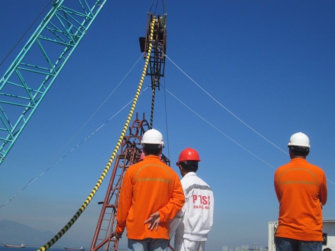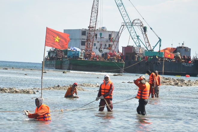 Các kỹ sư của Liên danh phải thi công thủ công giữa trời nắng nóng, công việc nặng nhọc, nhưng anh em đều vui vẻ để hoàn thành công trình có ý nghĩa quan trọng này cho bà con đảo Lý Sơn. |