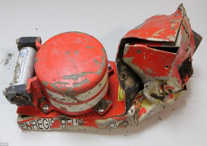 Hôm 25/3, lực lượng cứu hộ phát hiện hộp đen ghi âm buồng lái của chuyến bay và thu hồi nó. Hình ảnh mà giới chức Pháp công bố cho thấy thiết bị lưu trữ các cuộc hội đàm của phi công và mọi âm thanh trong khoang lái biến dạng nghiêm trọng do va đập. Tuy nhiên, các nhà điều tra vẫn có thể sử dụng dữ liệu của nó. Ảnh: AP