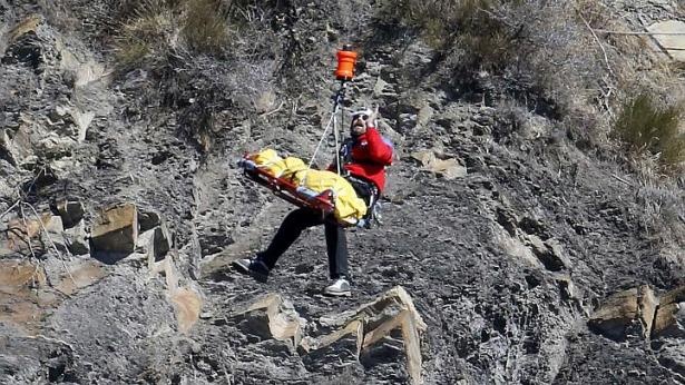 Do địa hình khu vực máy bay lao xuống quá hiểm trở, giới chức Pháp phát động chiến dịch không vận để đưa nạn nhân ra ngoài. Lực lượng cứu hộ đặt thi thể những người xấu số lên cáng và kéo lên trực thăng để chuyển ra khu tập kết gần hiện trường tai nạn. Ảnh: Reuters